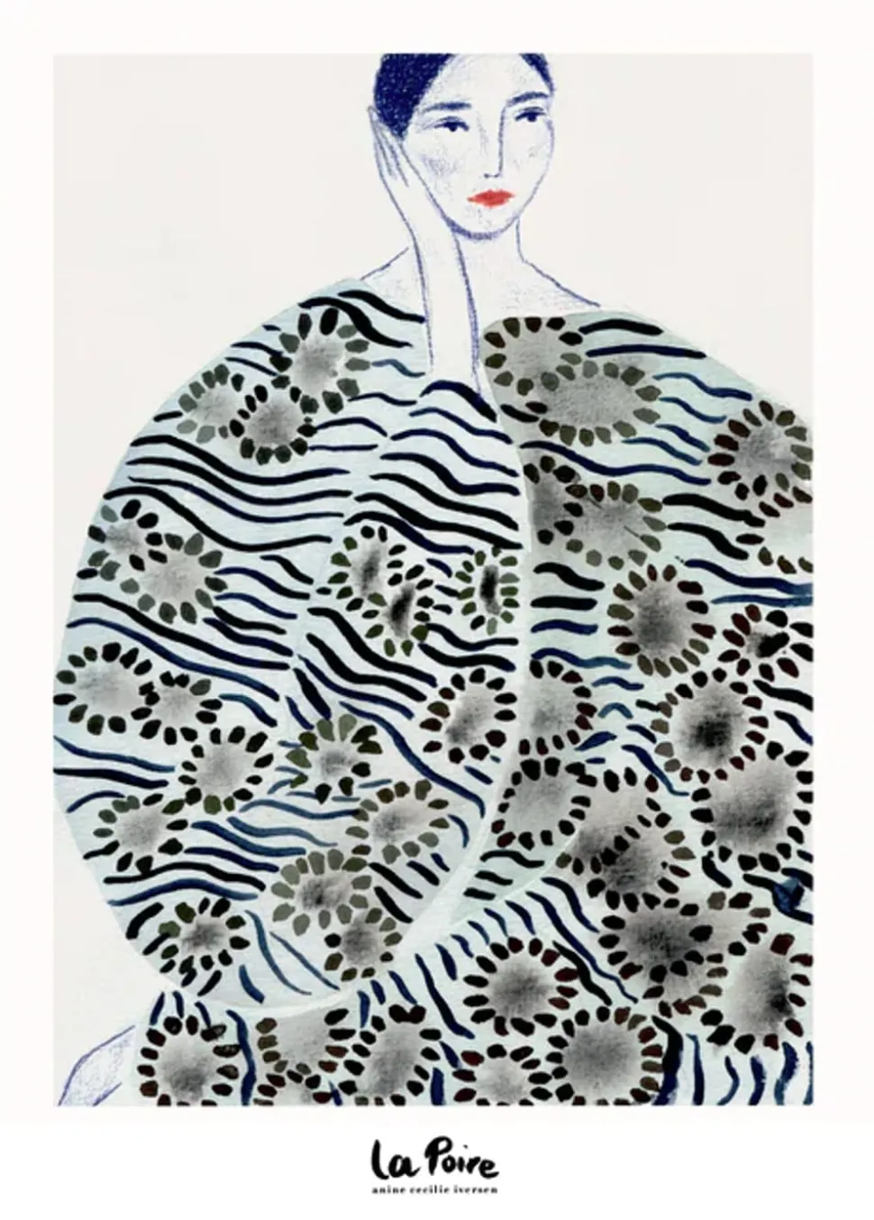 Schöne, nachdenkliche Frau mit schönen Farben. Das Plakat ist eine Reproduktion des Originals „Reminiscing“, das 2021 gemalt wurde. La Poire, die hinter dem Plakat steht, ist eine Künstlerin und Designerin, die seit ihrer Jugend malt. Inspiriert wird sie von französischen Künstlern und sozialen Medien, von klassischen und zeitgenössischen Künstlern.