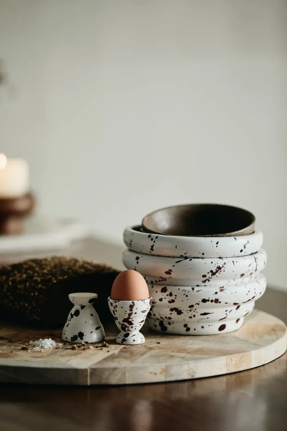 RIA Schale W. Splash von ist Teil der einzigartigen RIA-Serie, bei der jedes Stück eine handgefertigte und künstlerische Note trägt. Die Schale ist mit einem dynamischen dunkelbraunen Spritzmuster verziert, das einen lebendigen und individuellen Ausdruck schafft. Die organische Form und die glatte Oberfläche aus Steinzeug sorgen für ein angenehmes haptisches Erlebnis, während die solide Konstruktion sie ideal für den täglichen Gebrauch macht.