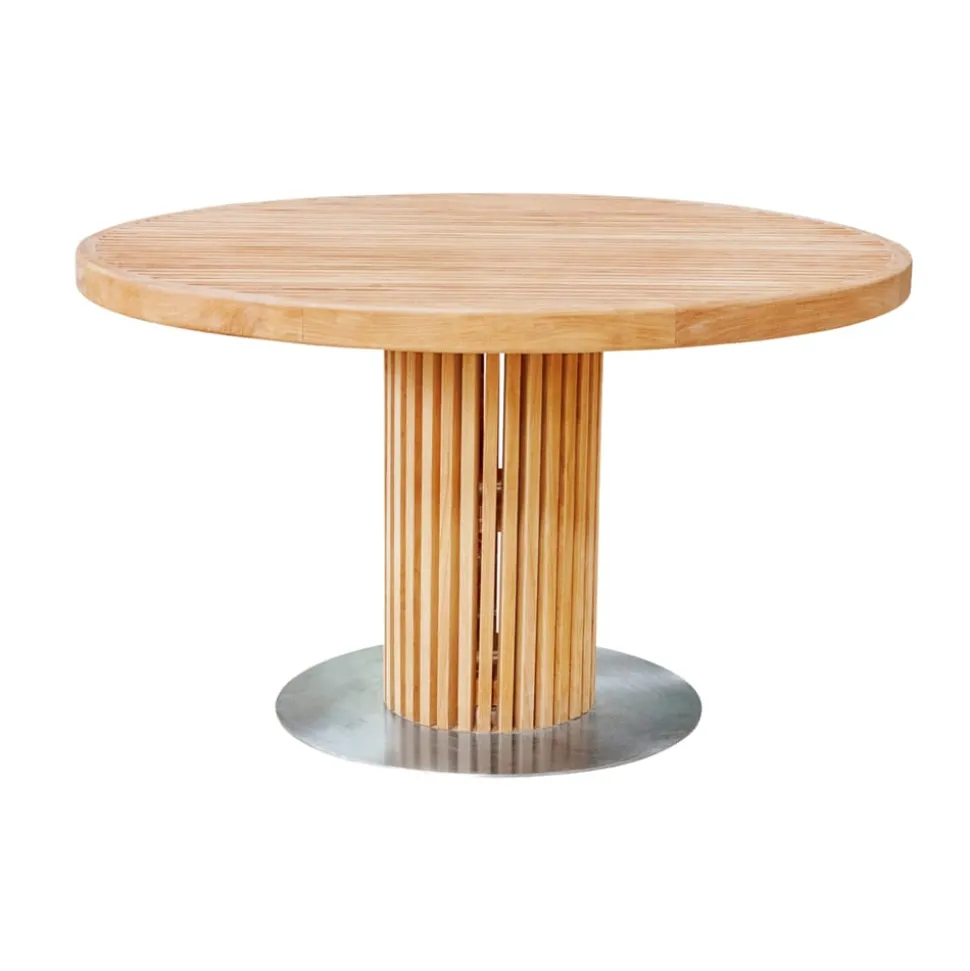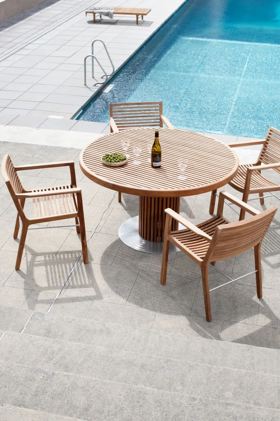 Mit seiner klaren, zeitlosen Silhouette und seiner kompromisslosen Qualität ist der Tisch eine offensichtliche Wahl für den modernen Außenbereich, in dem sowohl Design als auch Funktionalität an erster Stelle stehen. Die runde Tischplatte mit einem Durchmesser von 130 cm ist aus nachhaltigem Kernteakholz gefertigt – einem natürlichen, öligen Holz, das sich besonders gut für den Außenbereich eignet und mit der Zeit schön patiniert.