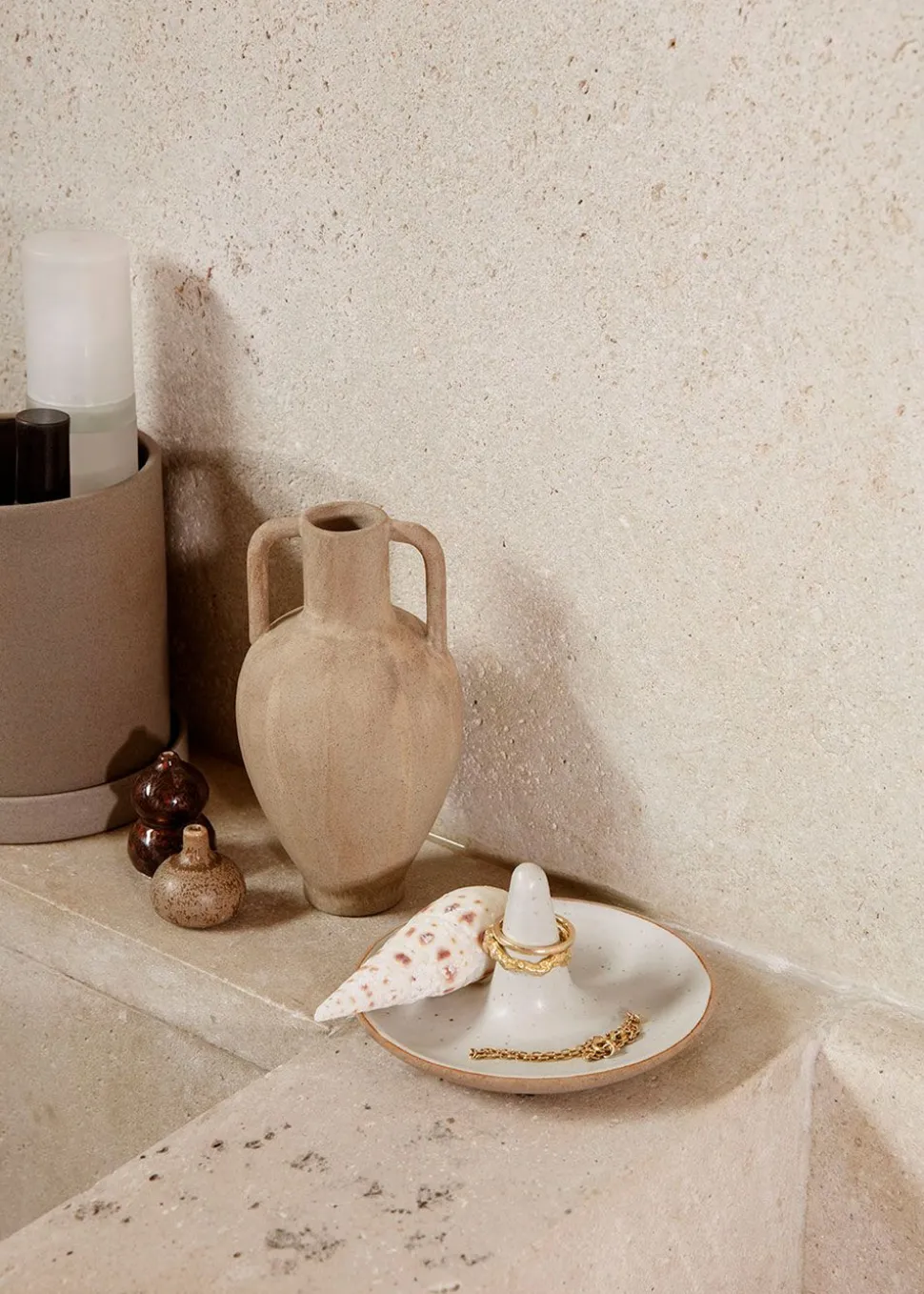 Der minimalistische Ring Cone von ist ein echter Gewinn für die Aufbewahrung von Schmuck. Der Ring Cone ist aus Rohporzellan mit einer matten, milchigen Glasur gefertigt. Er hat einen feinen, modernen Look und eignet sich ideal für das Badezimmer oder sogar für den Nachttisch.
