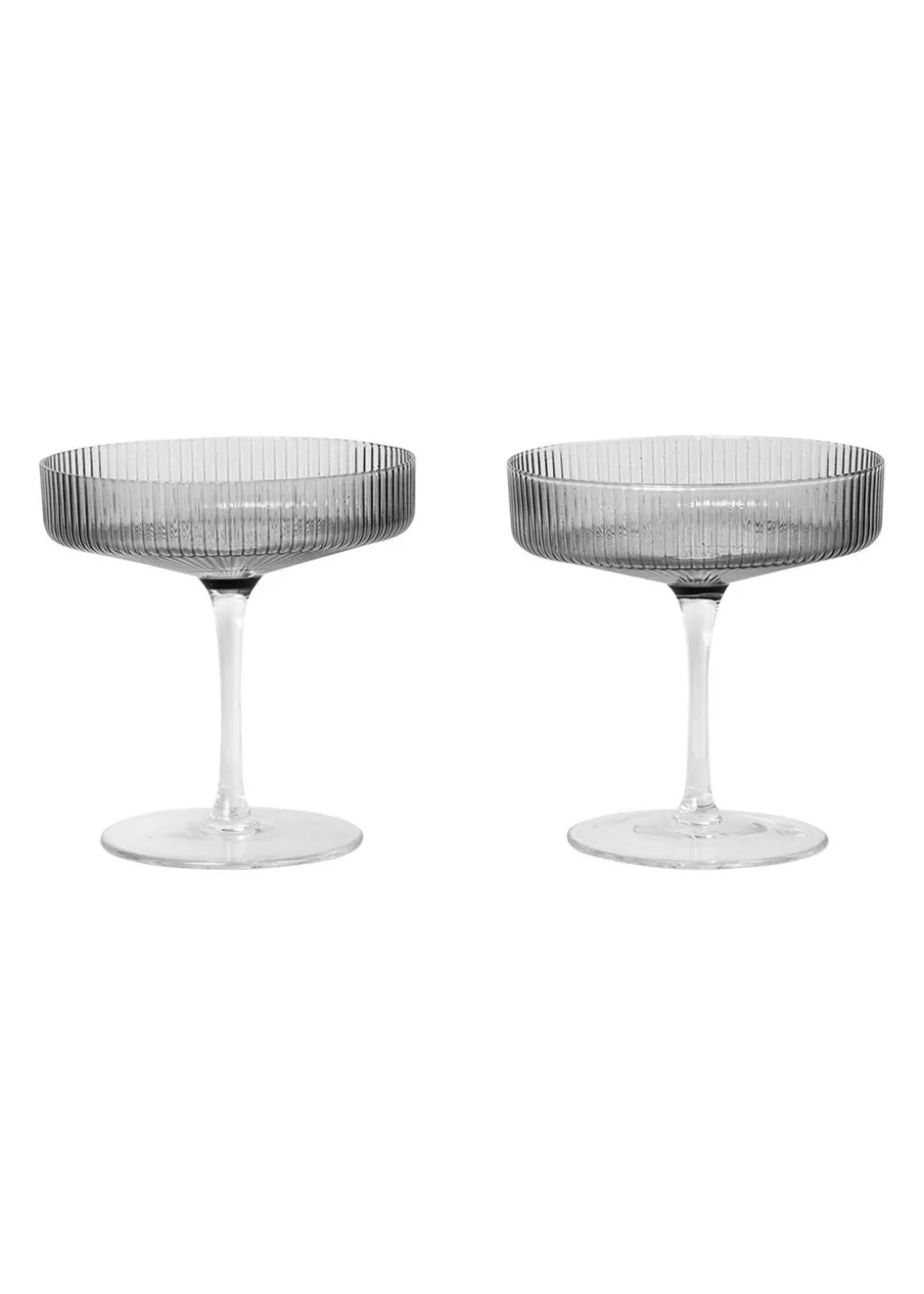 Die Serie Ripple von zeichnet sich durch ihre elegante gerippte Oberfläche aus, die dem Glas einen raffinierten und auffälligen Look verleiht. Der Champagner wird aus mundgeblasenem Glas im Vintage-Design hergestellt. Das flache Design kann sowohl als klassisches Sektglas, für Espresso-Martinis oder als einzigartige Art, Desserts zu servieren, verwendet werden.