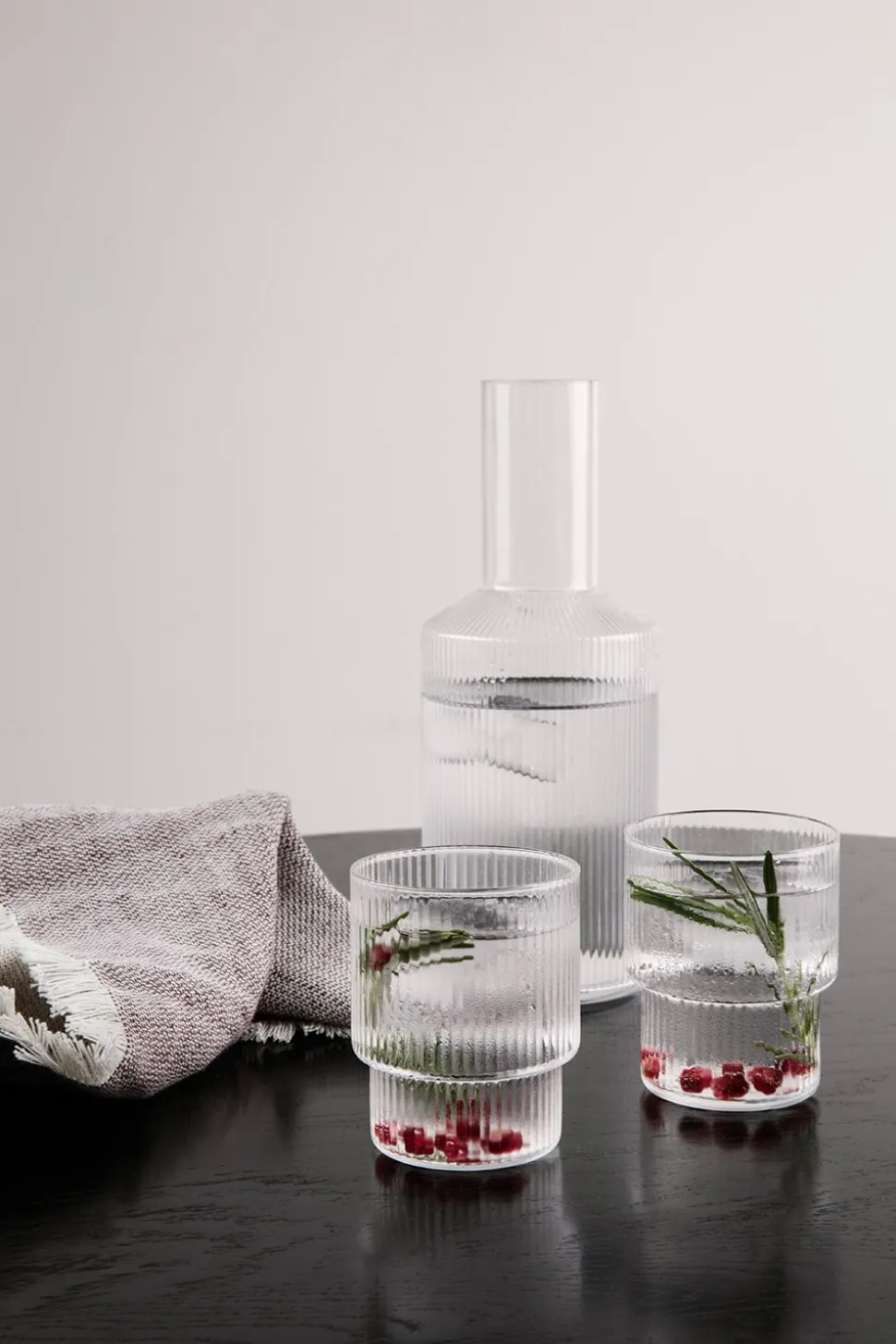 Die Serie Ripple von zeichnet sich durch ihre elegante gerippte Oberfläche aus, die dem Glas einen raffinierten und auffälligen Look verleiht. Die mundgeblasenen Trinkgläser sind in vier verschiedenen geometrischen Formen gehalten, von denen jede ihr eigenes Design hat und die in der Kombination auf dem gedeckten Tisch einen lebendigen und dynamischen Look ergeben. Ob Sie Ihre Ripple-Gläser mit dem Rest der Ripple-Reihe kombinieren oder mit anderen Zusammenstellungen experimentieren, die Gläser werden Ihren Getränken einen stilvollen Touch verleihen.