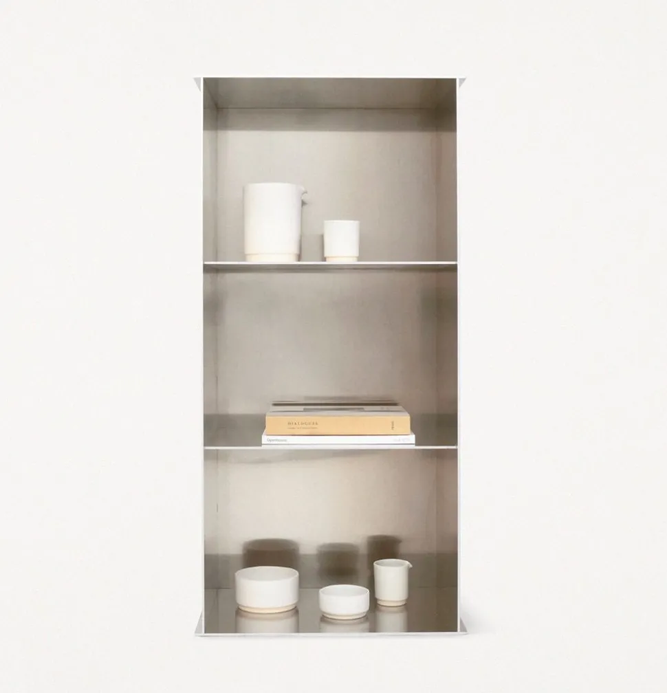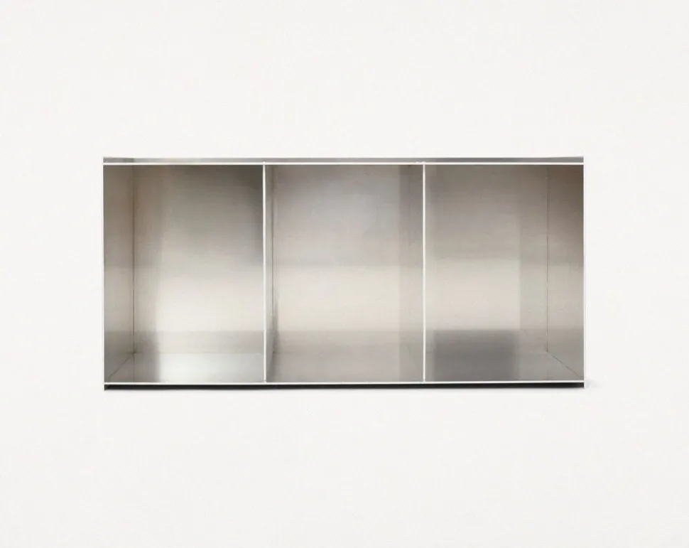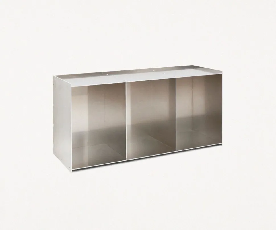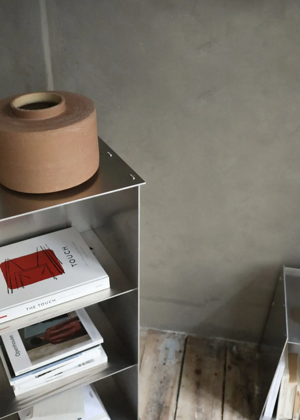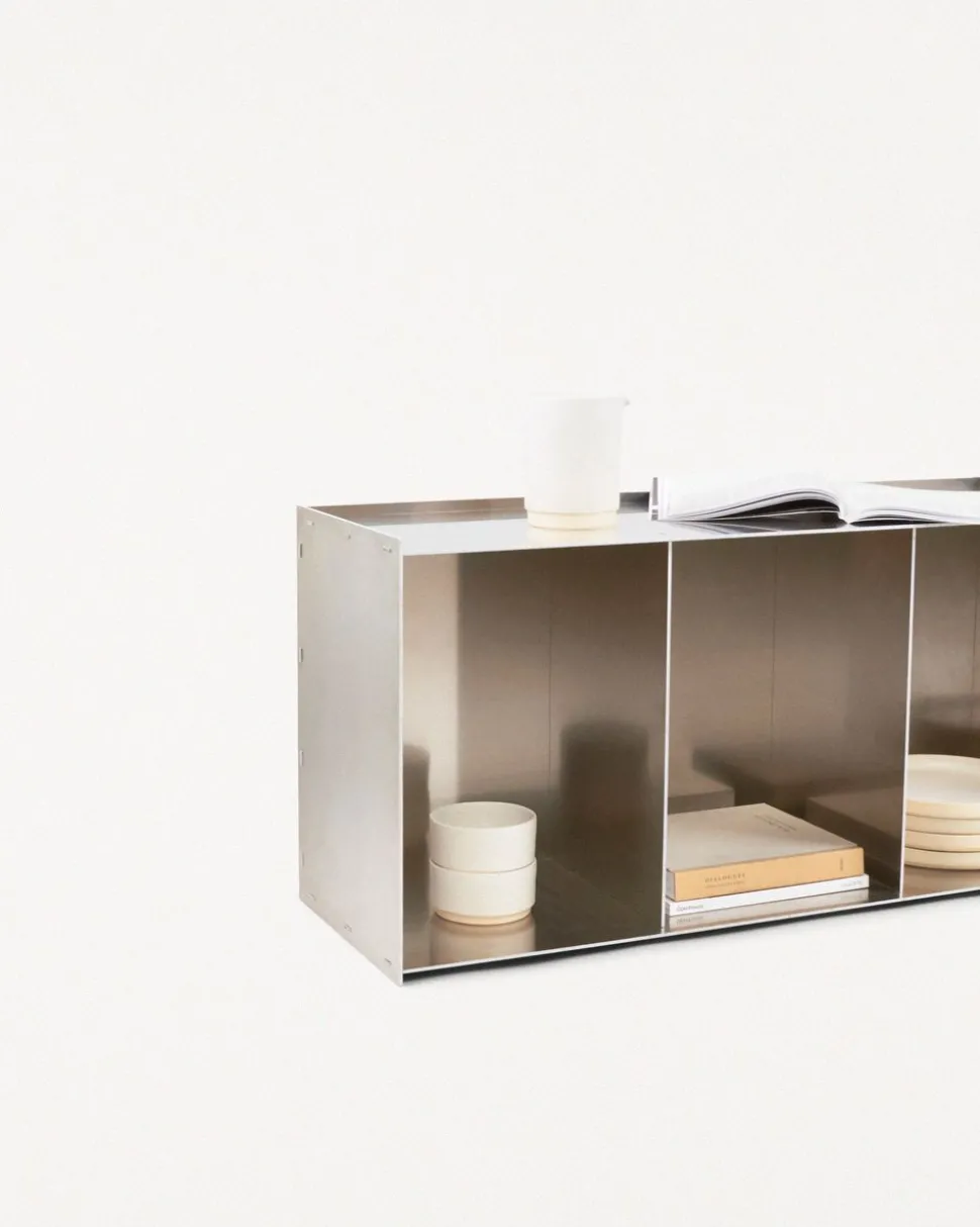 Die Nietensammlung der ist eine Hommage an den Werkstoff Aluminium, seine Eigenschaften sowie seinen rohen und industriellen Ausdruck. Die Harke besteht aus Aluminiumplatten, die mit historischer Technik durch Handkraft zusammengesetzt werden, wobei die Platten mit einem Hammer zusammengeschlagen werden, um ein dauerhaftes und vollständiges Aussehen zu erzielen. Der Nietkoffer wird mit einem multifunktionalen Design hergestellt, das sowohl vertikal als auch horizontal angeordnet werden kann. Das universelle Design eignet sich perfekt als Couchtisch mit Stauraum, als Regal für Bücher oder Geschirr oder als Bank im Eingangsbereich.