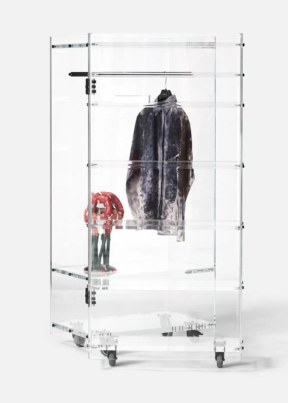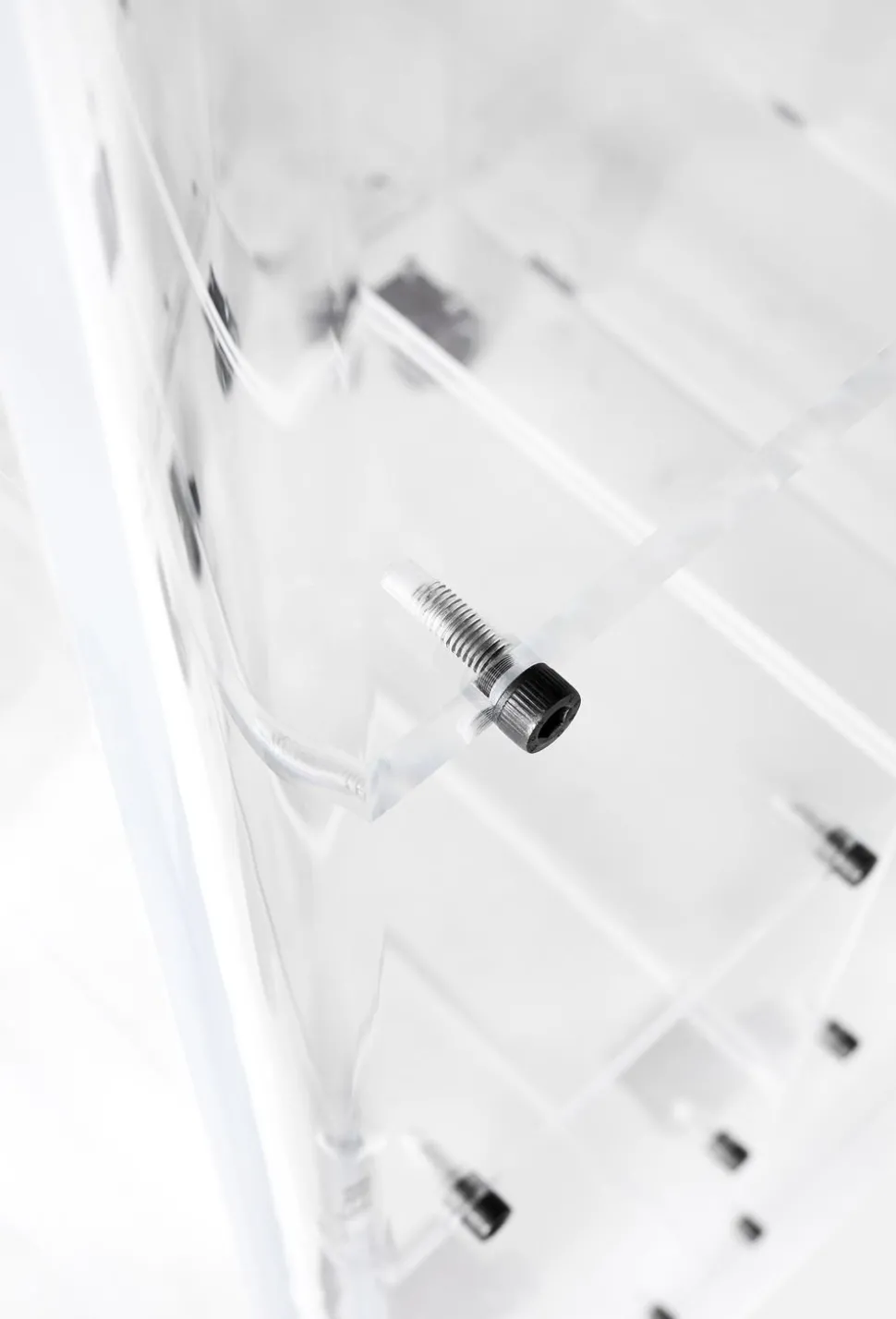 Roller Cabinet ist eines der einzigartigsten Designs von Knud Holscher, das Modernität mit klassischen Materialien und Funktionalität mit schlichtem Design verbindet. Die Form des Roller Cabinet ist sowohl im Design als auch in der Funktionalität stark von altmodischen Reisekoffern inspiriert, wobei der Schrank aus zwei massiven „Boxen“ besteht, die elegant miteinander verbunden sind. In dieser Version des klassischen Roller Cabinet hebt Knud Holscher die Verwendung moderner und anspruchsvoller Materialien auf eine ganz neue Ebene. Der Schrank aus transluzentem Acrylglas eröffnet noch mehr Möglichkeiten für die visuelle Aufbewahrung, perfekt für die Präsentation von Büchern, lebendiger Keramik, bewundernswerten Werken und Statement-Stücken.