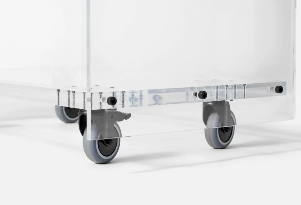 - Hergestellt aus Plexiglas mit schwarzen Metallschrauben und Rollen.