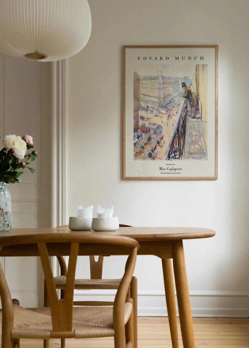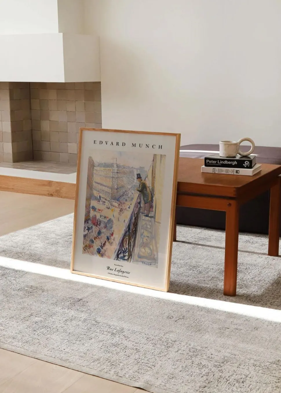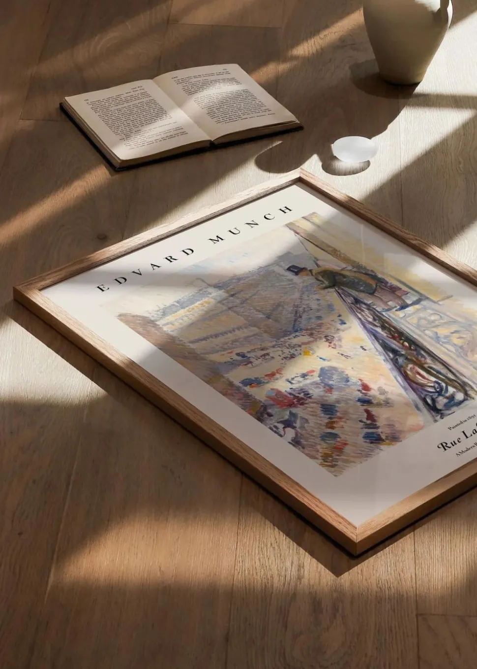 Die Rue Lafayette wurde vom Künstler Edvard Munch entworfen. Die einfachen Schattierungen des Plakats schaffen ein elegantes und zeitloses Design. Das Motiv zeigt eine belebte Straße mit vielen Menschen und Fahrzeugen. Man sieht eine Reihe von Menschen, die auf der Straße vorbeigehen, und im Hintergrund sind auch einige Häuser und Gebäude zu sehen.