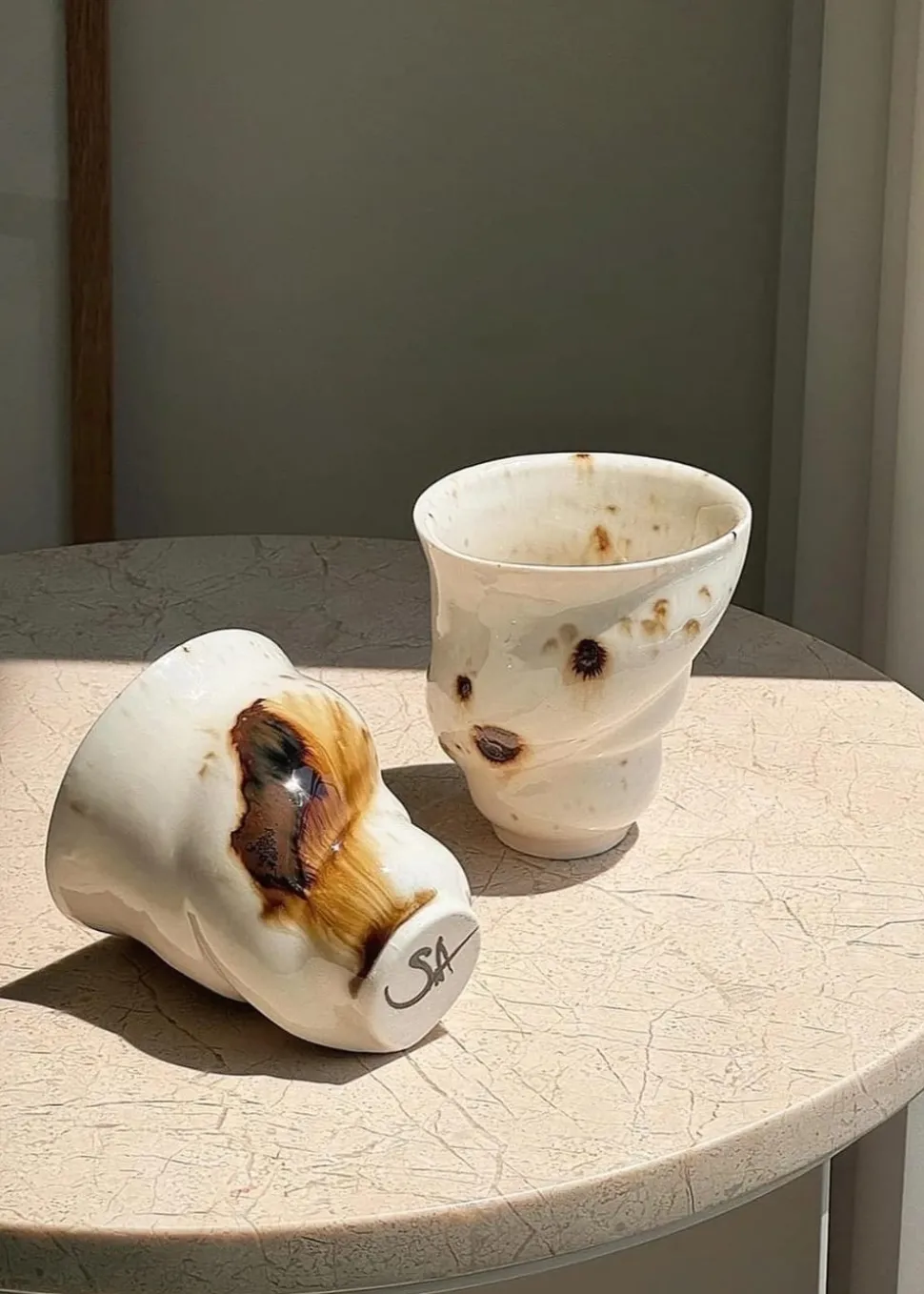 Da die Tassen handgefertigt werden, kann es zu geringfügigen Abweichungen in Farbe und Glasur kommen. Dies ist völlig normal und hat keinen Einfluss auf die Qualität, das allgemeine Aussehen oder die Verwendung des Produkts – das ist der Charme einer handgefertigten Tasse.