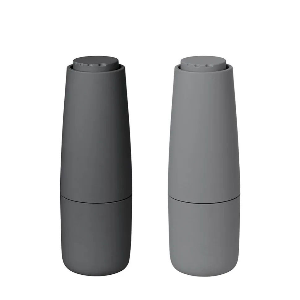 Die funktionalen Salz- und Pfeffermühlen werden von Flöz Industrie Design entworfen. Die Salz- und Pfeffermühlen sind aus Keramik und Kunststoff gefertigt. Über den einfachen Kupplungsmechanismus können die Mühlen geöffnet und wieder befüllt werden. Außerdem lässt sich die Korngröße von grob bis sehr fein einstellen.