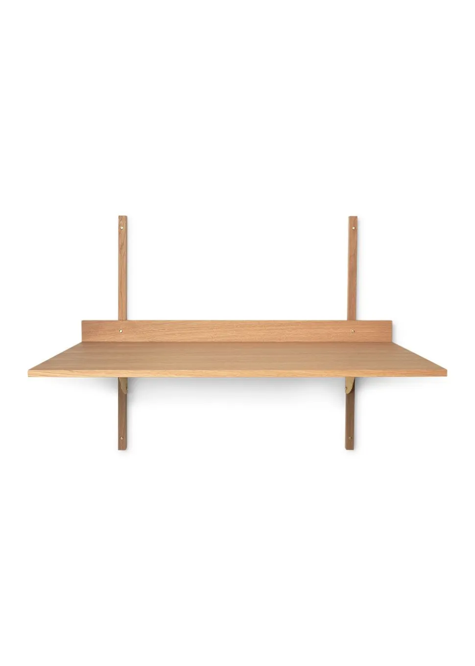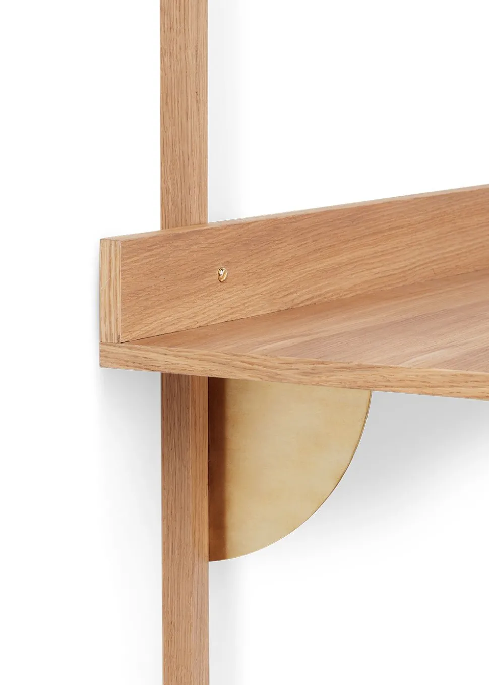 Sector Desk ist ein aufgesetzter Schreibtisch von . Sector ist eine neue und moderne Interpretation der Regalsysteme der 50er und 60er Jahre und zeichnet sich durch seine robuste Schlichtheit und die klassische Kombination aus Holz und Messing aus. Eine kurze Kante am Ende des Tisches schafft einen kleinen, schmalen Platz, der sich ideal für handschriftliche Notizen oder ein Lieblingsfoto eignet.
