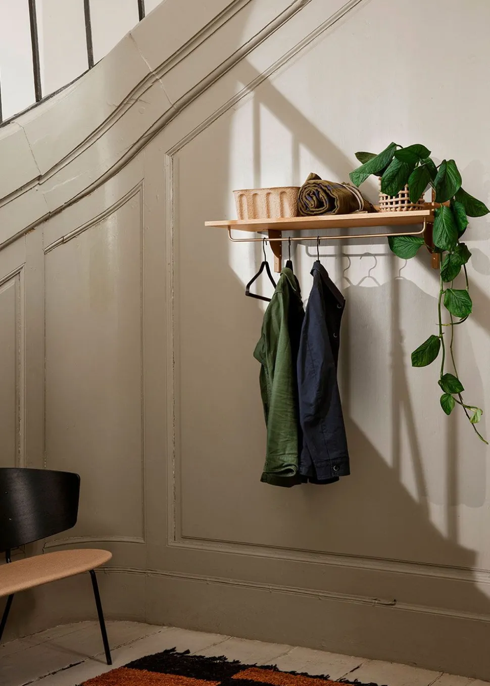Die neue und moderne Interpretation der Regalsysteme aus den 50er und 60er Jahren. Der Garderobenständer Sector von zeichnet sich durch seine robuste Schlichtheit und die klassische Kombination aus Holz und Messing aus. Platzieren Sie den Sektor in der Eingangshalle oder sogar im Schlafzimmer.