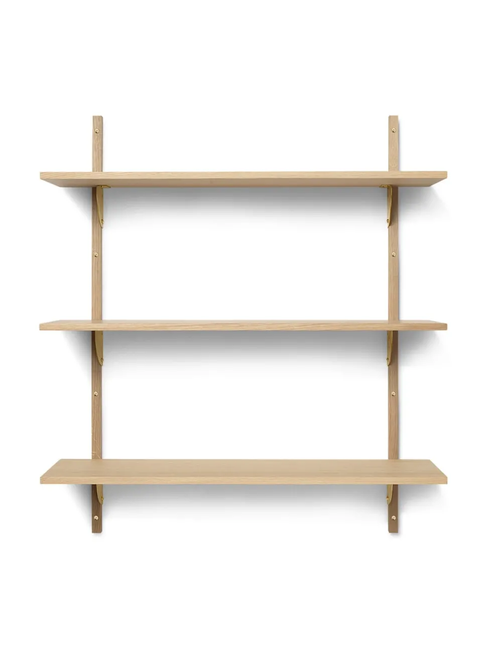 Sector Shelf ist ein Produkt von . Das Regal ist in einer breiten oder schmalen Version erhältlich, wobei Sie zwischen einem einfachen und einem dreifachen Regal wählen können. Das Regal ist auch in natürlichem Eichenfurnier oder schwarz gebeizter Esche mit Messing- oder schwarz lackierten Messingbeschlägen erhältlich. Das Regal lässt sich leicht mit einem feuchten Tuch reinigen, aber die Oberfläche sollte nicht nass werden. Das Regal wird mit den mitgelieferten Massivholzdübeln mit sichtbaren Schrauben an der Wand befestigt.