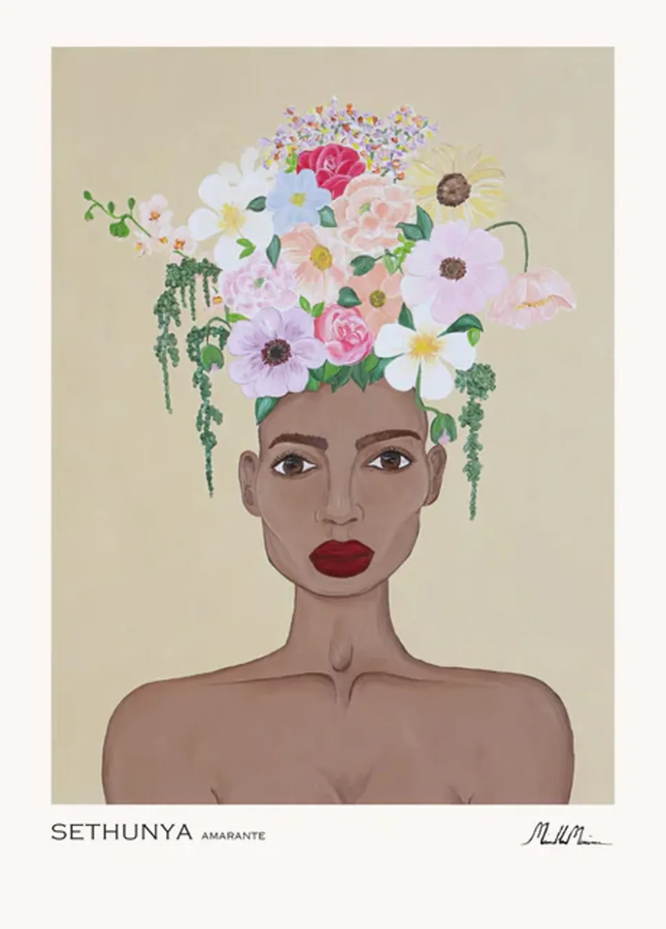 Schöne Frau mit grünen Blättern und pastellfarbenen Blumen auf dem Kopf. Der Name der Sethunya-Frau bedeutet „blühen, Blume“. Das Poster ist eine Fotogravur eines größeren Gemäldes.