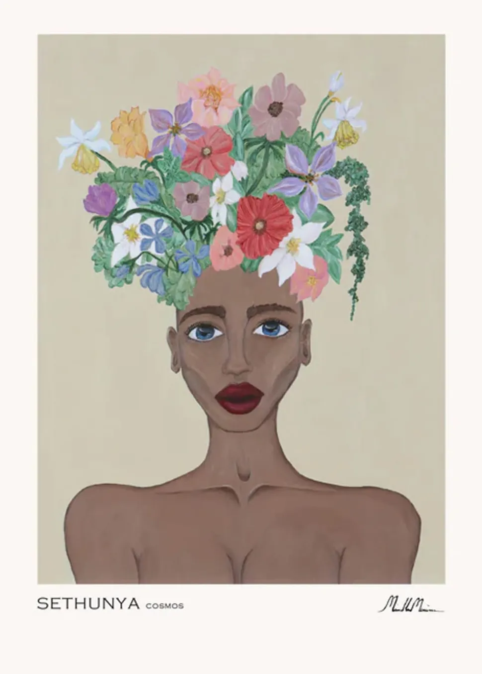 Schöne Frau mit grünen Blättern und bunten Blumen auf dem Kopf. Der Name der Sethunya-Frau bedeutet „blühen, Blume“. Das Poster ist eine Fotogravur eines größeren Gemäldes.