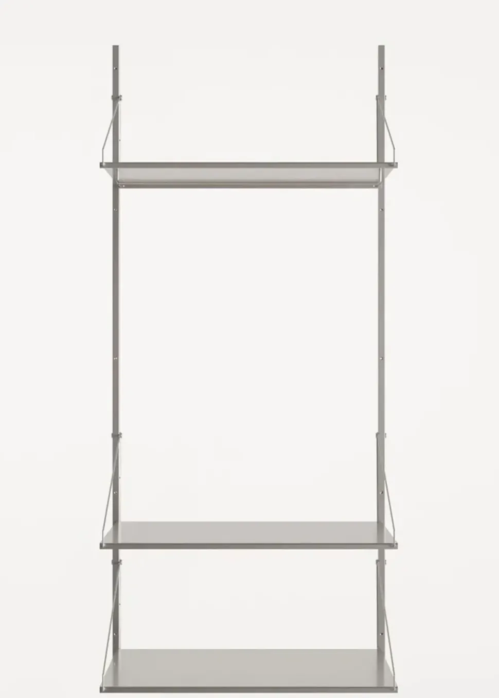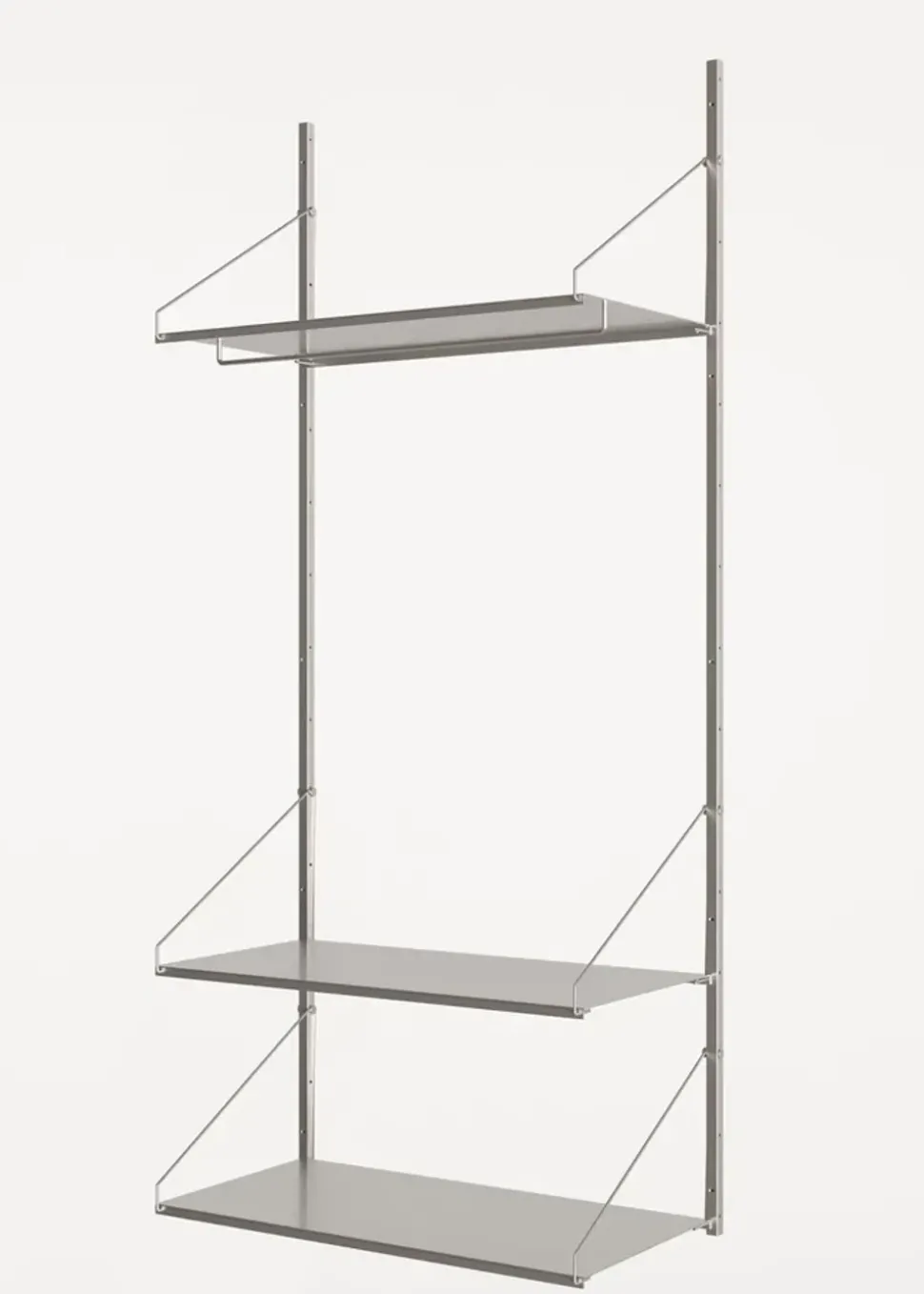 Die Regal-Bibliotheks-Kollektion ist ein FRAMA-Klassiker, der die Essenz des Frama-Design-Universums mit dem Schwerpunkt auf nordischem Minimalismus in organischen Materialien von höchster Qualität verkörpert. Der Designer Kim Richardt hat eine Reihe von universellen und multifunktionalen Elementen aus naturbelassener, weiß geölter und dunkel geölter Eiche sowie aus Edelstahl entworfen. Die Regale werden einfach an der Wandhalterung befestigt und können je nach Bedarf neu angeordnet werden. So entsteht ein universelles und zeitloses Design, bei dem der Kleiderbügel für Kleidung im Kleiderschrank oder für Pfannen in der Küche verwendet werden kann.
