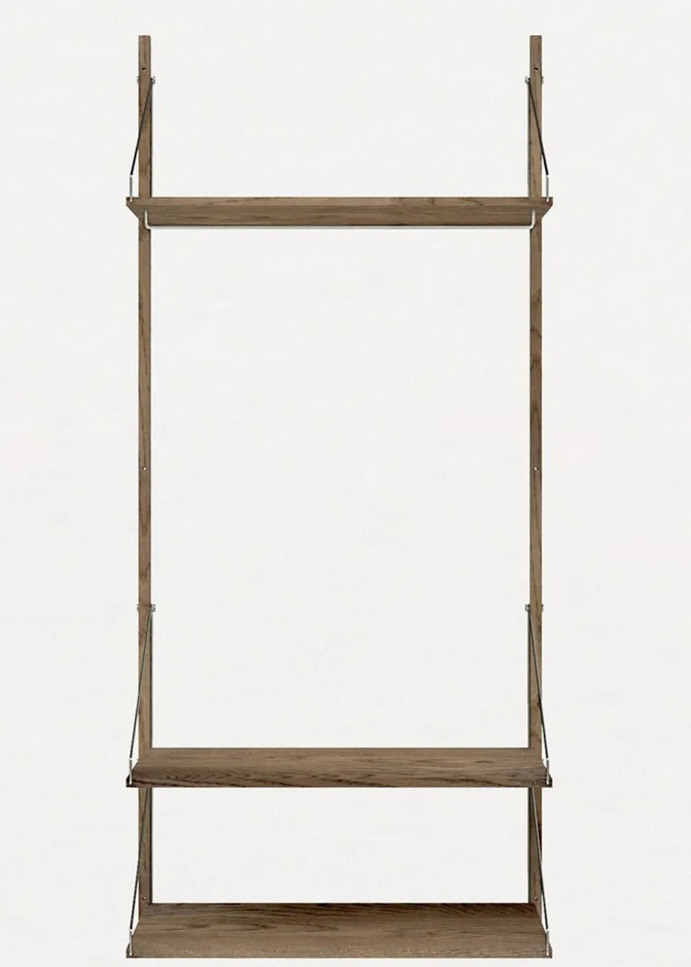 Die Regal-Bibliotheks-Kollektion ist ein FRAMA-Klassiker, der die Essenz des Frama-Design-Universums mit dem Schwerpunkt auf nordischem Minimalismus in organischen Materialien von höchster Qualität verkörpert. Der Designer Kim Richardt hat eine Reihe von universellen und multifunktionalen Elementen aus naturbelassener, weiß geölter und dunkel geölter Eiche sowie aus Edelstahl entworfen. Die Regale werden einfach an der Wandhalterung befestigt und können je nach Bedarf neu angeordnet werden. So entsteht ein universelles und zeitloses Design, bei dem der Kleiderbügel für Kleidung im Kleiderschrank oder für Pfannen in der Küche verwendet werden kann.