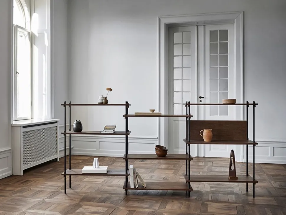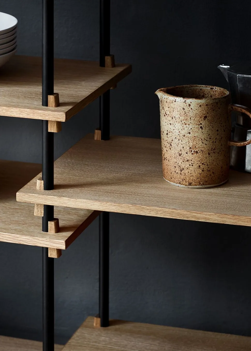 Das intelligente und einfache Regalsystem wird von Moebe hergestellt. Das Regalsystem ist aus Eiche in vielen verschiedenen Varianten gefertigt und wird mit Keilen aufgebaut. Die Keile bieten die Möglichkeit, die Regale und Systeme entsprechend den spezifischen Bedürfnissen zu platzieren. Die Möbel können z.B. so hoch oder so breit wie gewünscht. Es ist auch möglich, um Ecken herum zu bauen. Das System kann auch an einer Wand oder zusammen mit anderen Regalsystemen der Serie „Regalsystem“ aufgestellt werden. Das intelligente Regalsystem kann auch als Raumteiler fungieren.