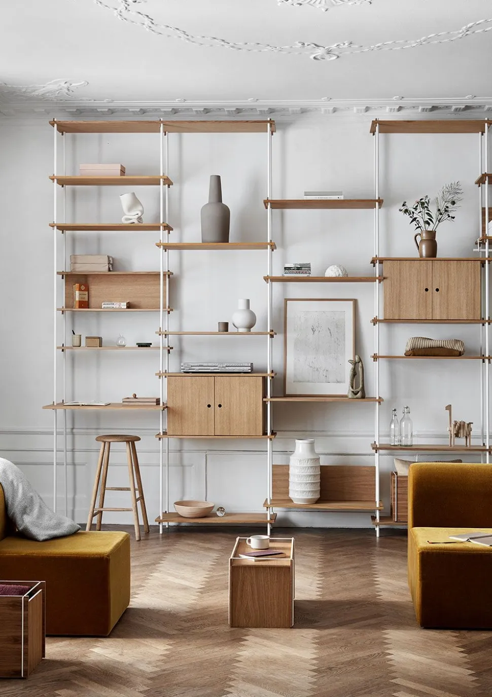 Das intelligente und einfache Regalsystem wird von Moebe hergestellt. Das ‚Regalsystem – S.200.1.A‘ ist aus Eiche in vielen schönen Varianten gefertigt. Das Regalsystem ist mit Keilen konstruiert, die die Möglichkeit bieten, die Systeme und Regale je nach den spezifischen Bedürfnissen zu platzieren. Die Möbel können z.B. so hoch oder so breit wie gewünscht. Es ist auch möglich, um Ecken herum zu bauen. Das System kann auch als Raumteiler dienen, wenn es an eine Wand gestellt oder mit anderen Regalsystemen der Serie „Regalsystem“ kombiniert wird.