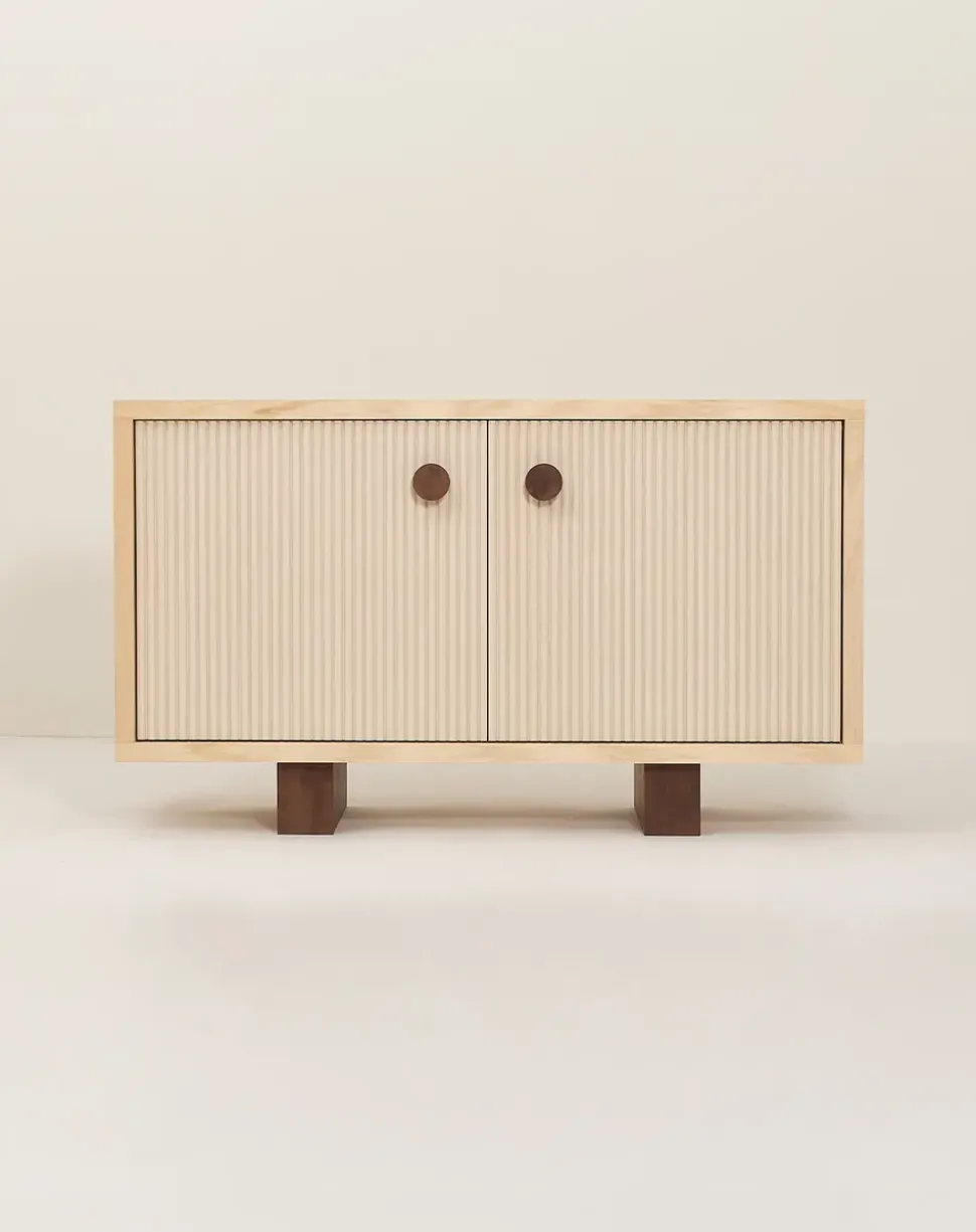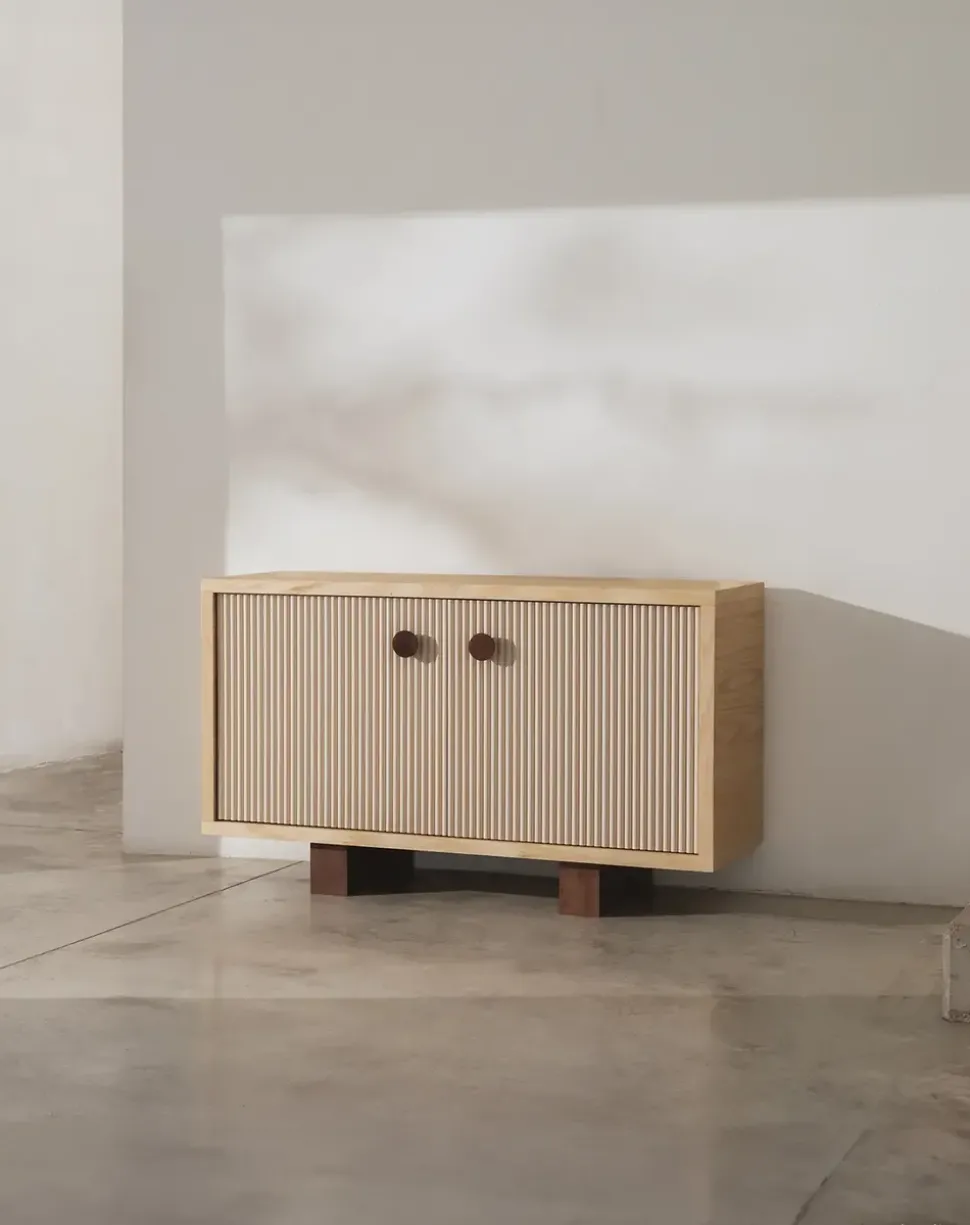 Das in Zusammenarbeit mit dem Studio Heju entworfene Heju X Sideboard von verbindet minimalistische Ästhetik mit skulpturalen Details. Das Sideboard ist aus hellem Eschenholz gefertigt, das mit dunklen Holztönen kombiniert wird, wodurch ein subtiler Kontrast und ein zeitloser Look entsteht. Die feinen, geriffelten Türen spielen mit Licht und Schatten und verleihen dem Möbelstück eine dynamische Dimension.