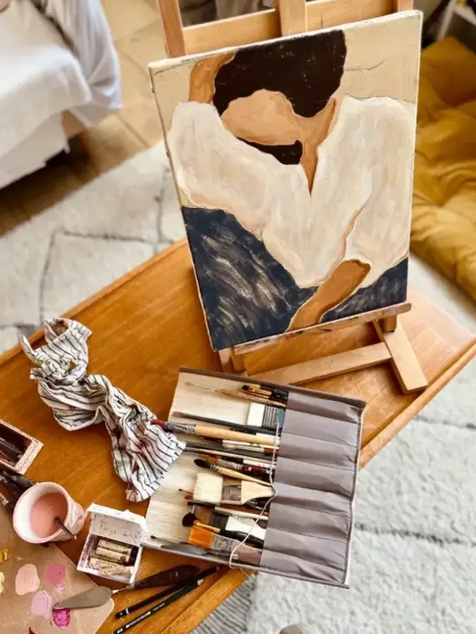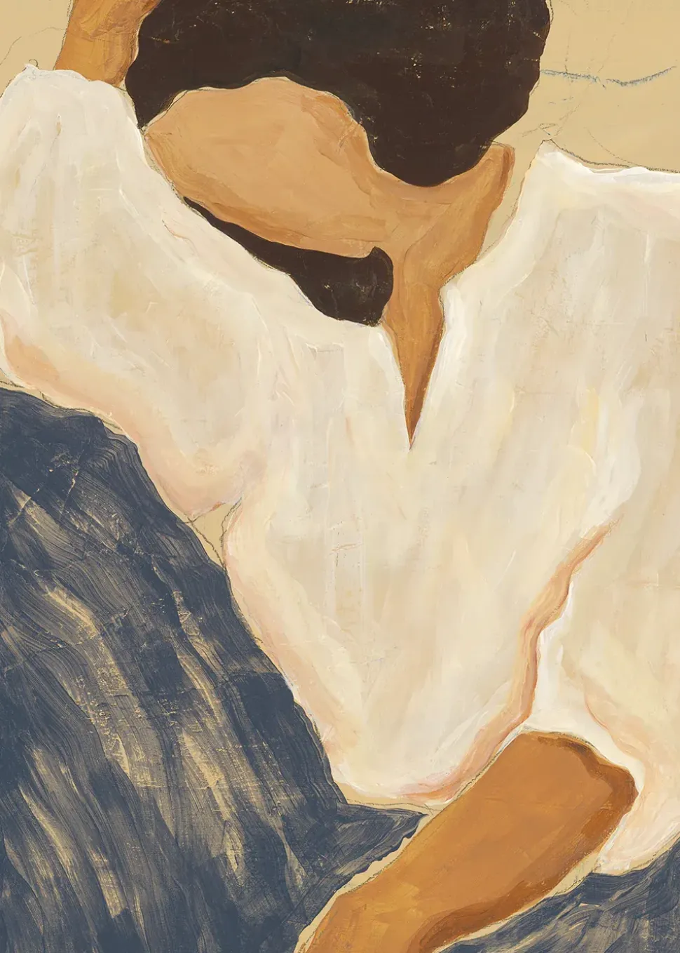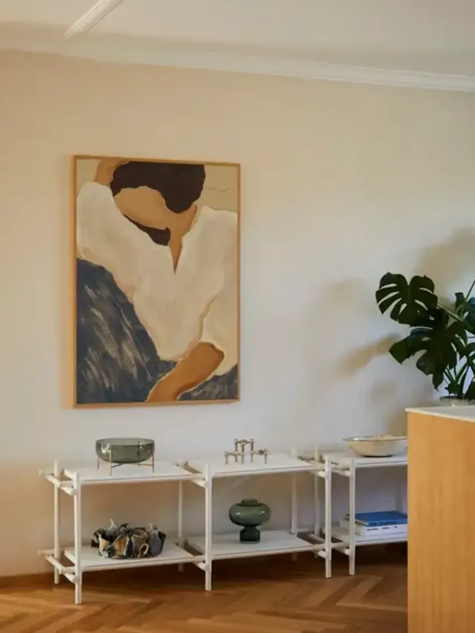Das Design des französischen Künstlerduos SacréeFrangine erkundet die Schönheit stiller Alltagssituationen und präsentiert eine zurückhaltende Herangehensweise an Form und Thema – sanfte Farbstriche in Blau, Weiß und Braun bringen die Komposition zusammen.