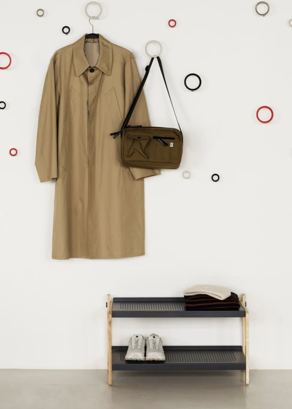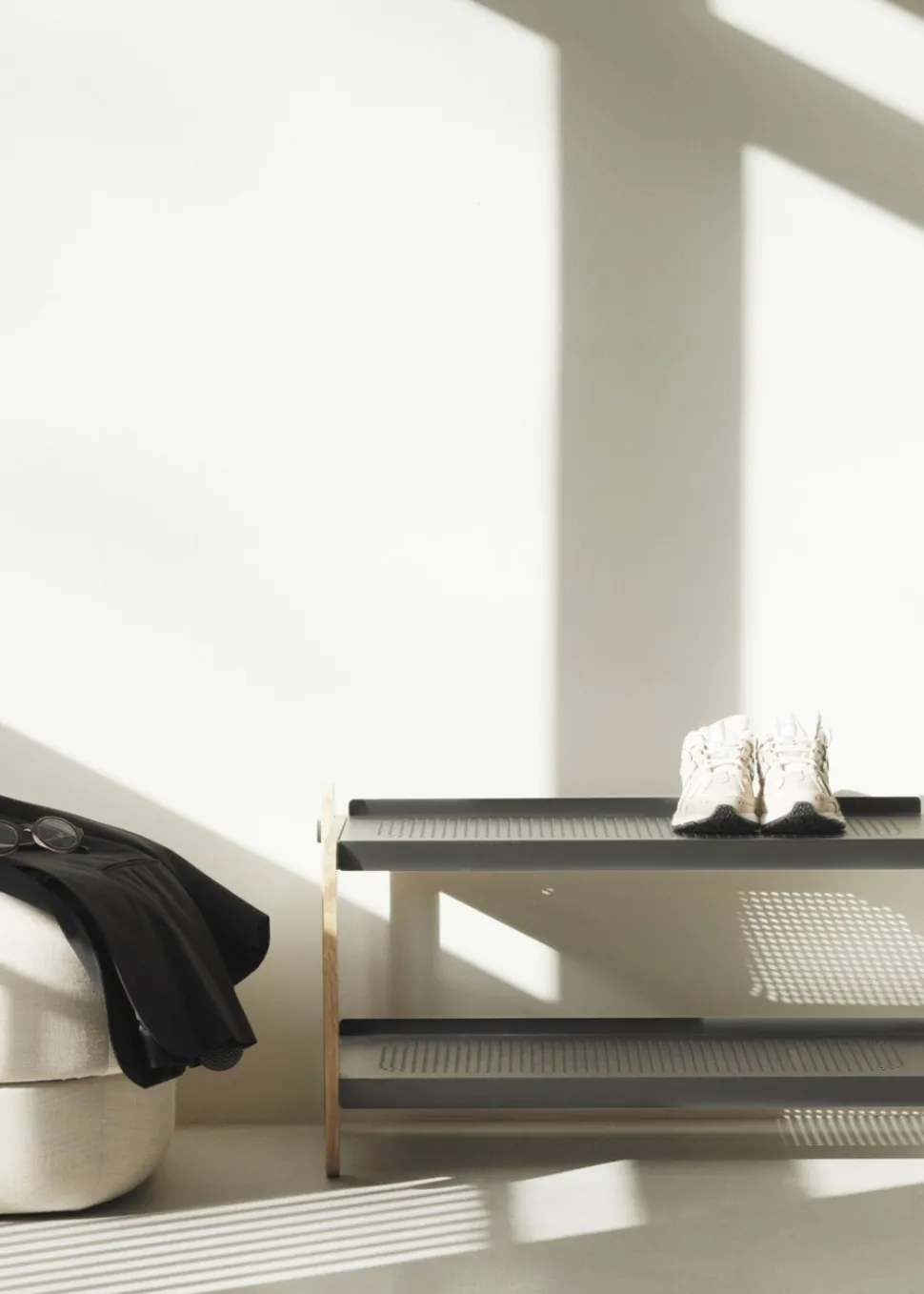 Das Schuhregal von ist ein Entwurf von Simon Legald. Das Schuhregal besteht aus Eschenholz mit Einlegeböden in reinem Weiß oder intensivem Grau und ist ohne unnötige Elemente gestaltet. Schrauben und Bolzen sind hervorgehoben und die Löcher in den Regalen erzeugen ein Schattenspiel auf dem Boden. Super praktisch und schön für den Flur oder den Hauswirtschaftsraum.