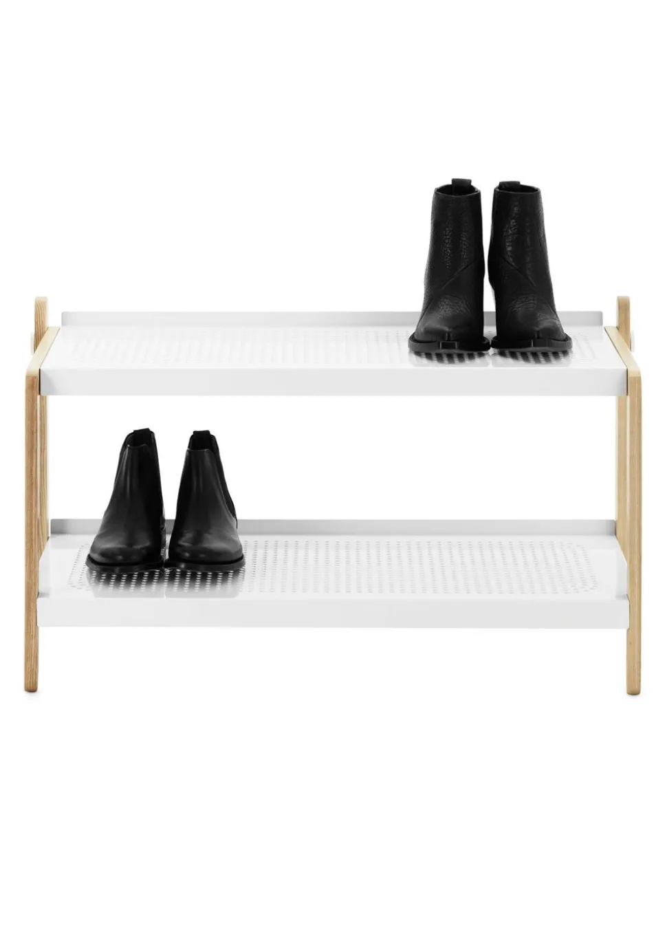 Das Schuhregal von ist ein Entwurf von Simon Legald. Das Schuhregal besteht aus Eschenholz mit Einlegeböden in reinem Weiß oder intensivem Grau und ist ohne unnötige Elemente gestaltet. Schrauben und Bolzen sind hervorgehoben und die Löcher in den Regalen erzeugen ein Schattenspiel auf dem Boden. Super praktisch und schön für den Flur oder den Hauswirtschaftsraum.