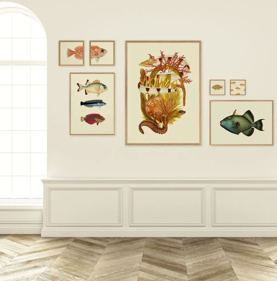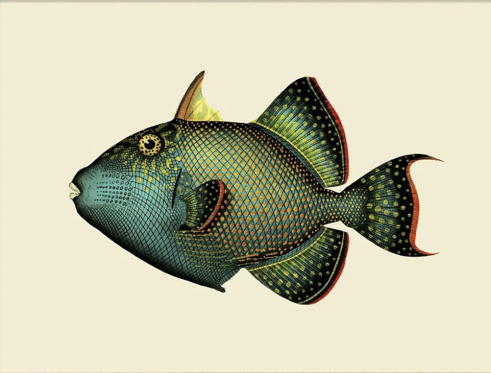 Einzigartiges und farbenfrohes Poster von The Dybdahl co. eines wunderschönen farbigen Fisches in Blautönen mit feinen orangefarbenen Details, gemalt mit japanischer Archivtinte, die dem Poster intensive und auffällige Farben verleiht.