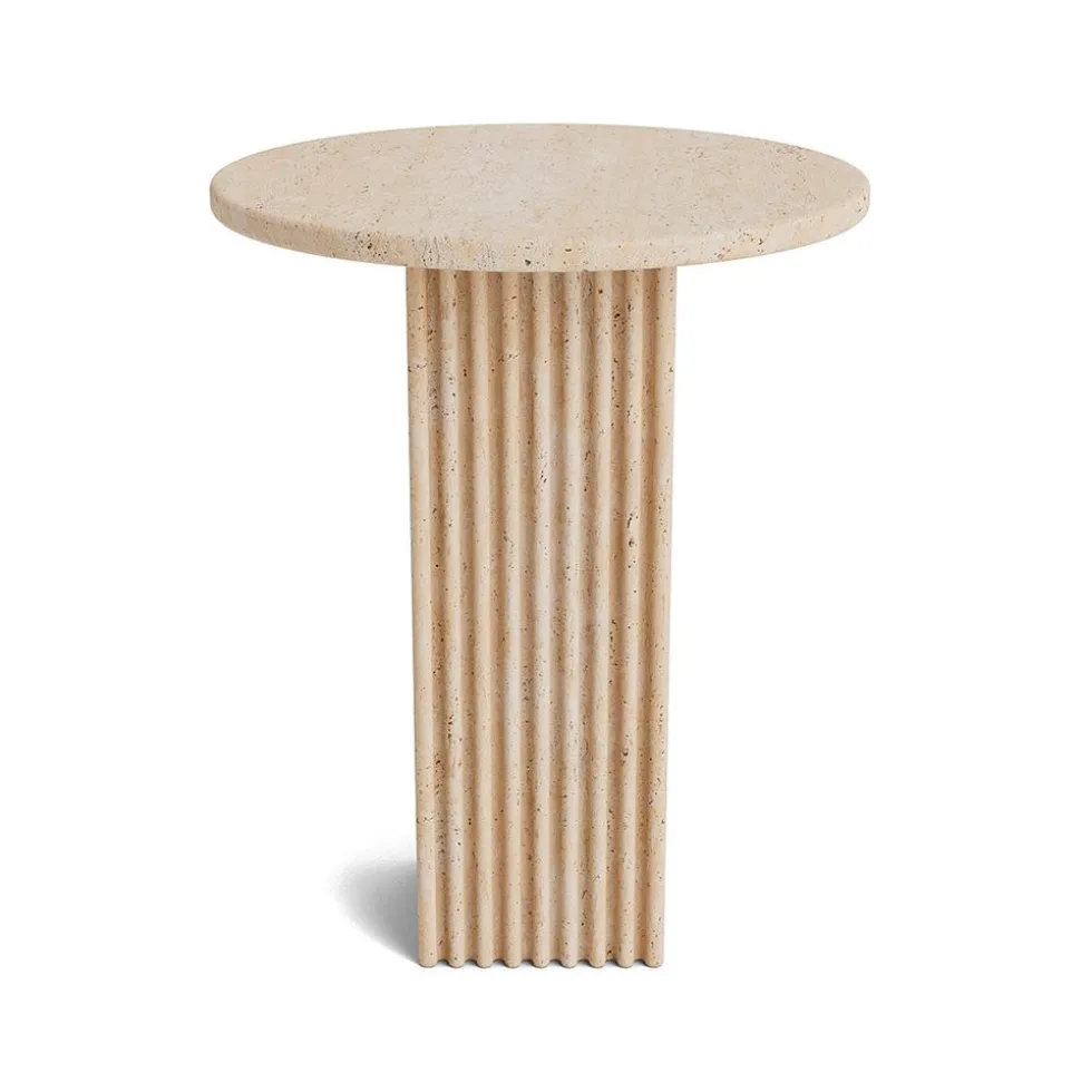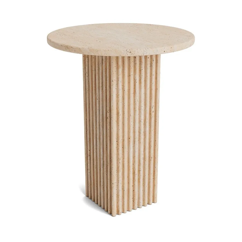 Die Kollektion Soho ist reich an architektonischen Referenzen, die an architektonische Gebäudefassaden erinnern, um ein vertikales und schlankes Tischdesign zu schaffen. Die geriffelte Oberfläche des Natursteins verleiht ihm Taktilität, während die Schatten den ganzen Tag über mit der Tiefe und dem Charakter der Steinoberfläche spielen. Der Tisch Soho ist aus Travertin gefertigt, der mit seinen kleinen Löchern und subtilen Unregelmäßigkeiten eine natürliche Schönheit ausstrahlt. Die leichte Konstruktion des Tisches, der aus Travertinplatten besteht, macht es dennoch einfach, ihn zu bewegen.