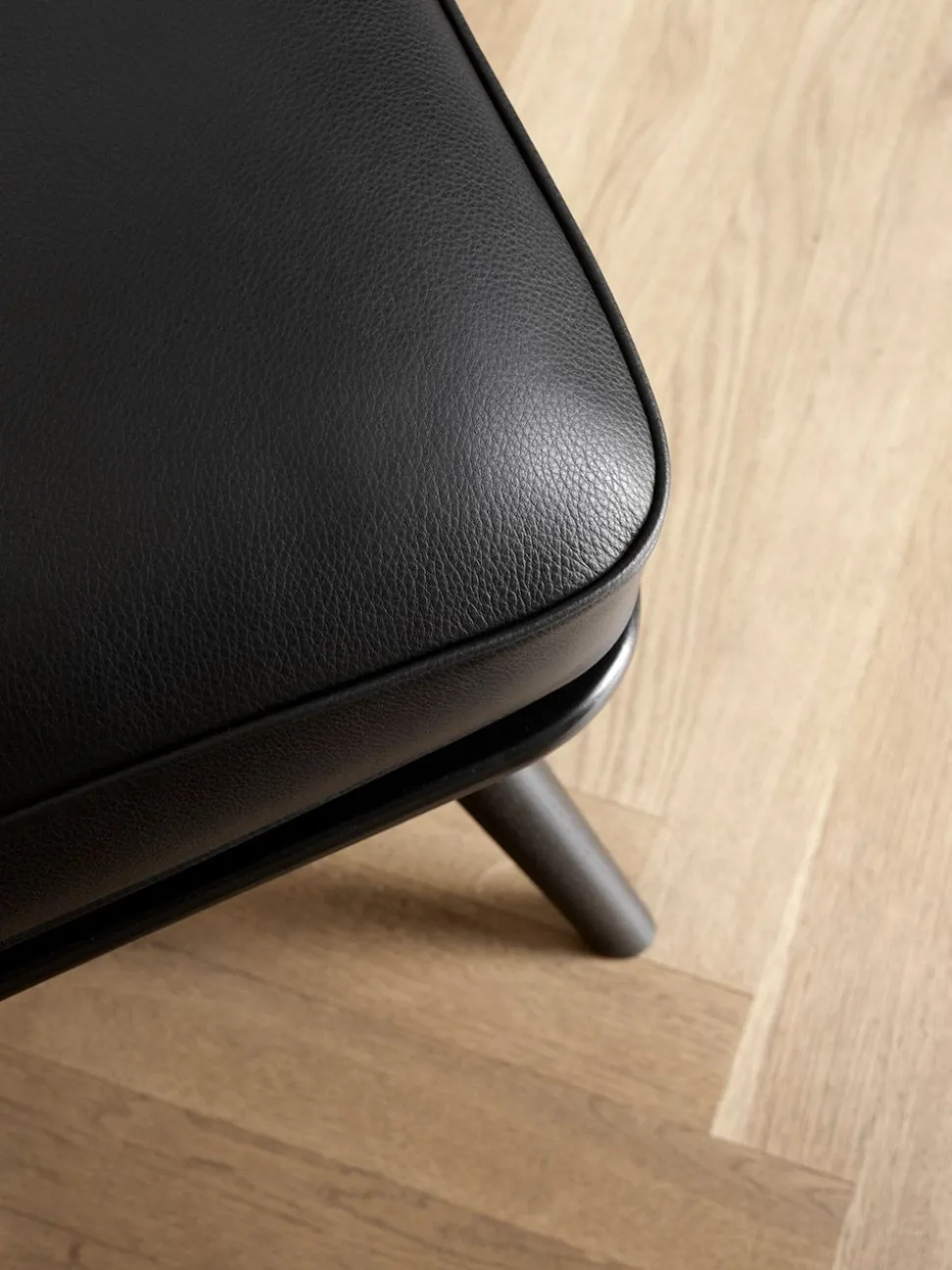 - Gestell aus klar/schwarz lackierter oder geräucherter geölter Eiche mit pulverbeschichteten Aluminiumsprossen. Sitzschale aus Sperrholz mit Buchenkern. Sitz poliert mit CMHR-Schaum und gepolstert mit Textil oder Leder nach Wahl, mit Keder abgeschlossen. Die Kissen sind mit Klettverschlüssen versehen, um die Reinigung der Möbel zu erleichtern.