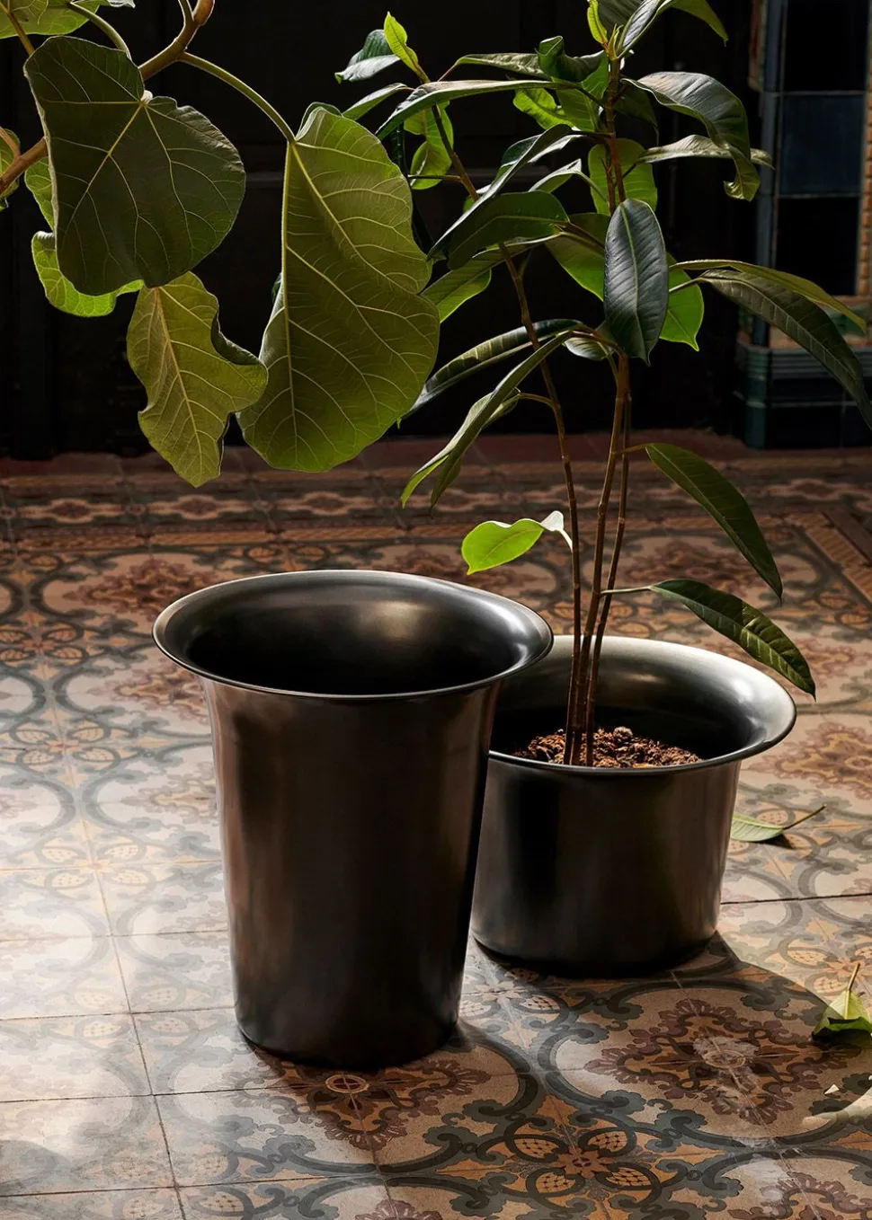 DerSpun Alu Basket von ist ein universeller und langlebiger Korb mit einem eleganten und doch rauen Ausdruck. Der Korb ist aus metallgedrehtem Aluminium gefertigt, was ihm eine schlanke Form verleiht, und ist in elegantem Schwarz gehalten. Durch das schlichte Design ist der Korb vielseitig einsetzbar und kann für Pflanzen, als Papierkorb oder zur Aufbewahrung von Regenschirmen im Eingangsbereich verwendet werden.