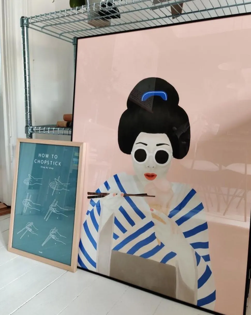 Super schönes Poster von taishō. Stäbchen und Kugeln stellen eine traditionelle Geisha dar, die eine altmodische Eiswaffel isst – natürlich mit Stäbchen. Geisha bedeutet auf Japanisch „Künstlerin“.