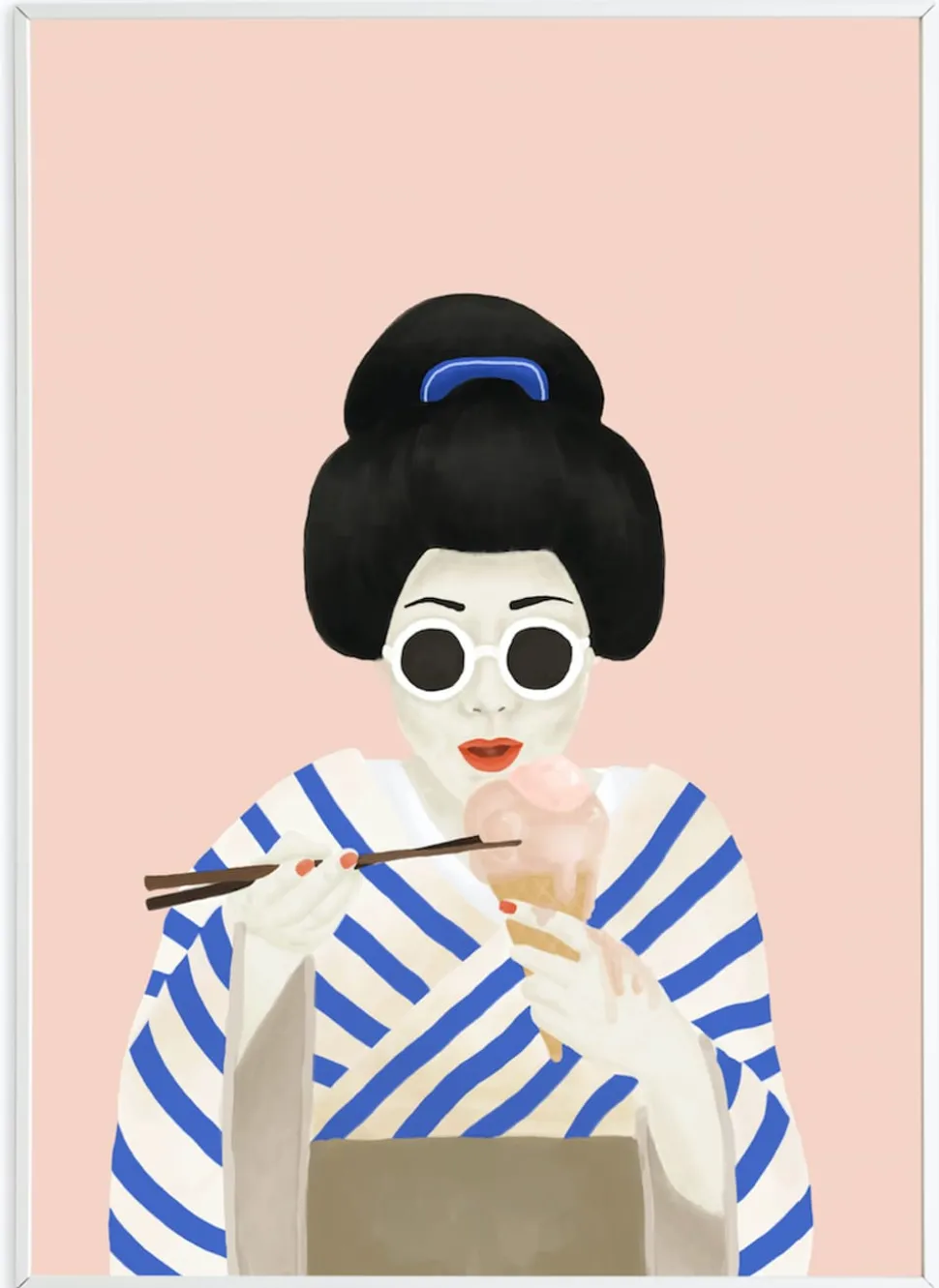 Super schönes Poster von taishō. Stäbchen und Kugeln stellen eine traditionelle Geisha dar, die eine altmodische Eiswaffel isst – natürlich mit Stäbchen. Geisha bedeutet auf Japanisch „Künstlerin“.