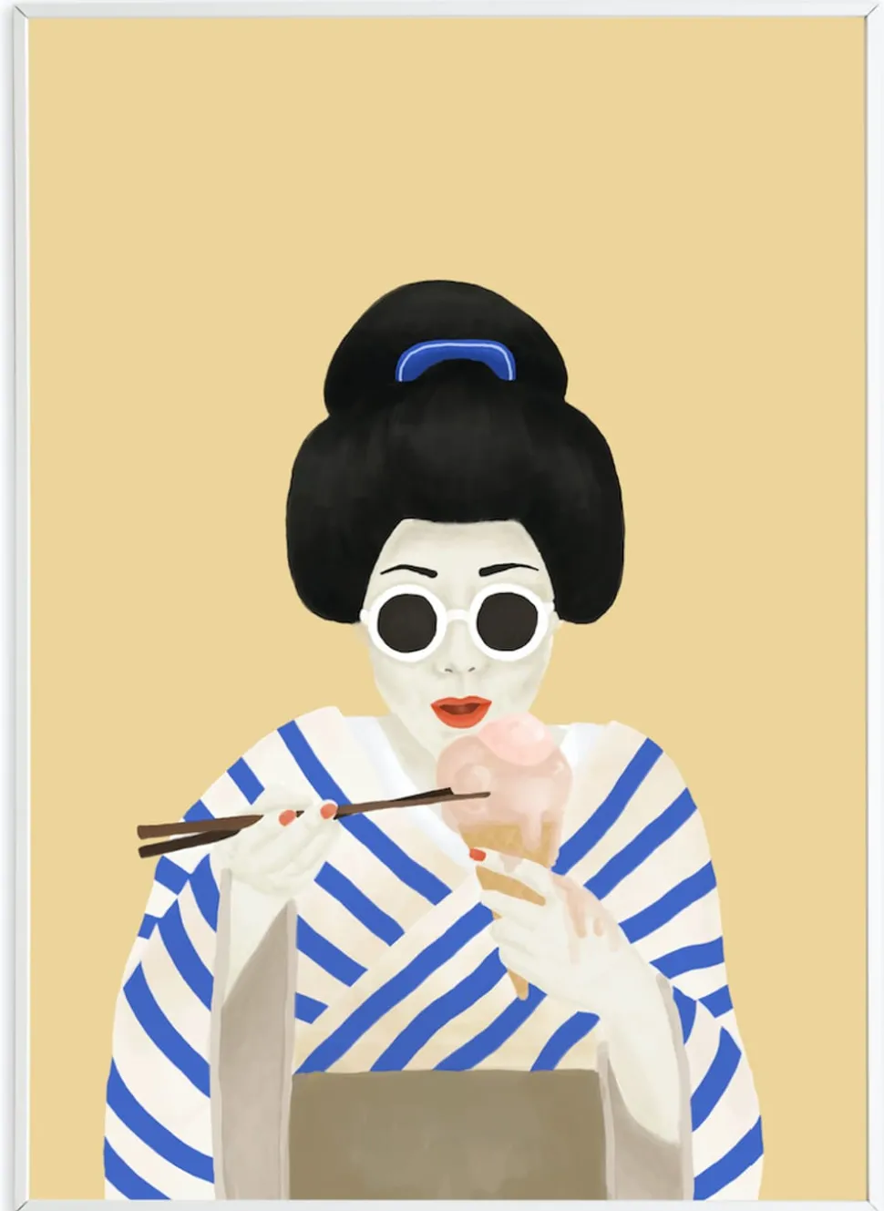 Super schönes Poster von taishō. Stäbchen und Kugeln stellen eine traditionelle Geisha dar, die eine altmodische Eiswaffel isst – natürlich mit Stäbchen. Geisha bedeutet auf Japanisch „Künstlerin“.
