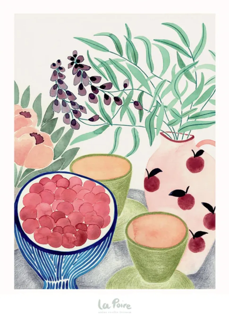 Tee und Weintrauben mit schönen Vasen und bunten Blumen drum herum. Das Plakat ist eine Reproduktion des Originalbildes „Stillleben mit Tee und Trauben“, das 2020 gemalt/gezeichnet wurde. La Poire, die hinter dem Plakat steht, ist eine Künstlerin und Designerin, die schon seit ihrer Jugend malt. Inspiriert wird sie von französischen Künstlern und sozialen Medien, von klassischen und zeitgenössischen Künstlern.