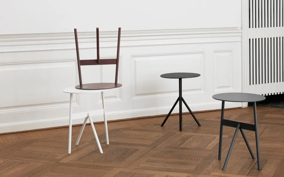 Basierend auf den elementarsten Stahlteilen hat das MSDS Studio einen architektonisch kleinen Beistelltisch geschaffen. Der Stocktisch zeigt Metall in einer rohen und dekonstruierten Art und Weise, während er gleichzeitig eine zarte, starre Qualität beibehält. Die unkonventionelle Beinanordnung des Tisches betont die Stärke des Materials und sorgt für eine interessante Komposition der Elemente. Die ästhetischen Negativräume – der luftige Hohlraum unter der runden Tischplatte und das Dreieck zwischen den abgewinkelten Beinen – sind das Ergebnis der Missachtung der traditionellen Anordnung der Tischbeine und der Schaffung einer neuen Form der Symmetrie. Stock wirkt wie eine kleine strenge Skulptur, die gleichzeitig als praktischer, stabiler Beistelltisch dient.