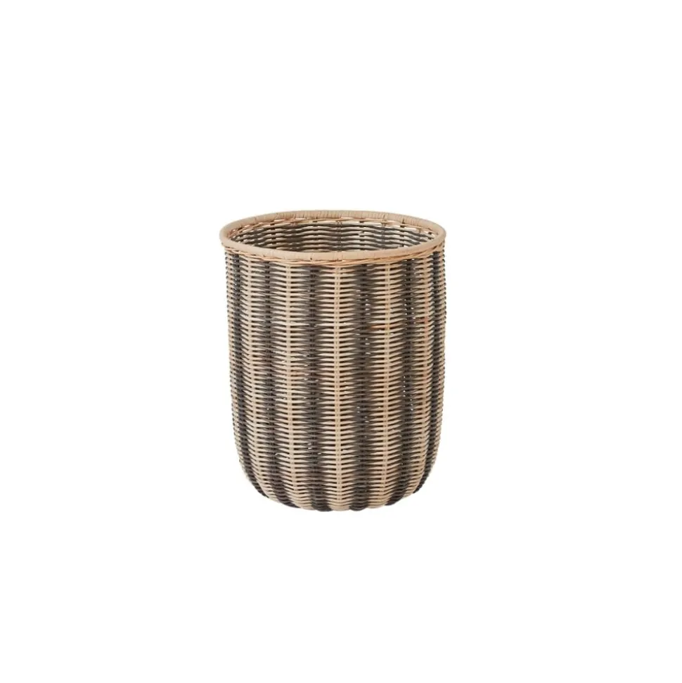 Handgeflochtener Korb aus Rattan, mit schwarzen Streifen. Das schlichte Design macht es sowohl praktisch als auch schön, es stehen zu haben. Der Korb ist vielseitig verwendbar, z. B. als Schattenspender für Pflanzen, für Spielzeug im Kinderzimmer oder für Kissen und Decken im Wohnzimmer.