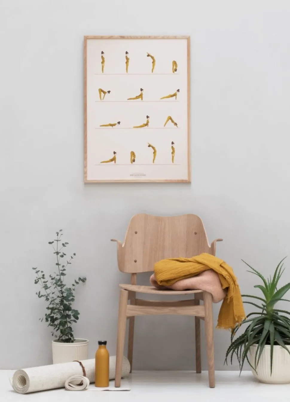 Ein Gruß an die aufgehende Sonne. Machen Sie einige Morgengymnastik und stärken Sie die Geschmeidigkeit des Körpers. Hängen Sie das Plakat dort auf, wo Sie Ihre Morgengymnastik machen wollen oder einfach zur Dekoration und Freude zusammen mit anderen schönen Plakaten.