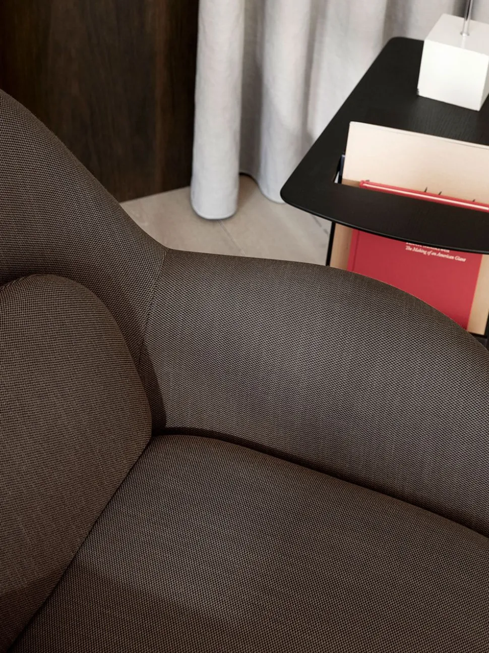 Die Kollektion zeichnet sich besonders durch ihre weiche Formensprache aus. Bei ‚Swoon‘ verschmelzen Arm- und Rückenlehne zu einer Einheit und werden durch voluminöse Kissen ergänzt, die für ein gutes Sitzerlebnis sorgen. Einzigartig an der Serie ist die Kombination von Konversationsstuhl und Sessel, die in einem Möbelstück vereint sind. Die Proportionen des Hybrids sind bei diesem Modell auf ein Minimum reduziert, was dem Stuhl ein dezenteres Aussehen verleiht, aber dennoch den Körper stützt. Schließlich wird der Stuhl mit einem Holzrahmen kombiniert, der dem Stuhl ein informelles Aussehen verleiht, das die Sitzfläche des Stuhls perfekt ergänzt.