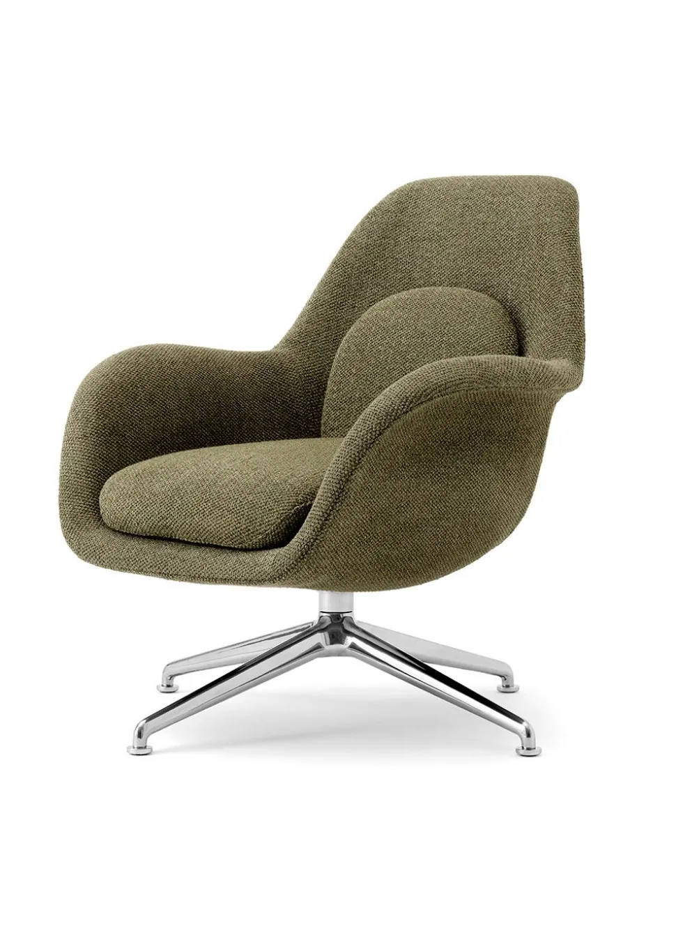 Die Kollektion zeichnet sich besonders durch ihre weiche Formensprache aus. Bei „Swoon“ verschmelzen Arm- und Rückenlehne zu einer Einheit und werden durch voluminöse Kissen ergänzt, die für ein gutes Sitzerlebnis sorgen. Einzigartig an der Serie ist die Kombination von Gesprächsstuhl und Sessel in einem Möbelstück. Die Proportionen des Hybrids sind bei diesem Modell auf ein Minimum reduziert, was dem Stuhl ein dezenteres Aussehen verleiht, aber dennoch den Körper stützt. Schließlich wird der Stuhl mit einem Drehfuß aus schwarzem oder poliertem Aluminium kombiniert, der sich ideal für eine Büroumgebung eignet.