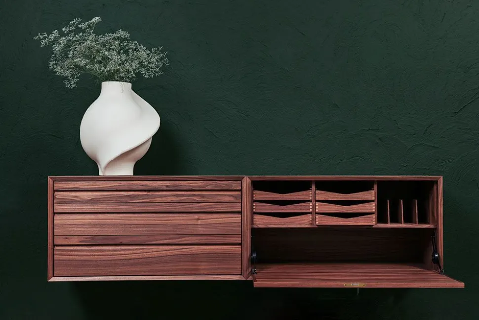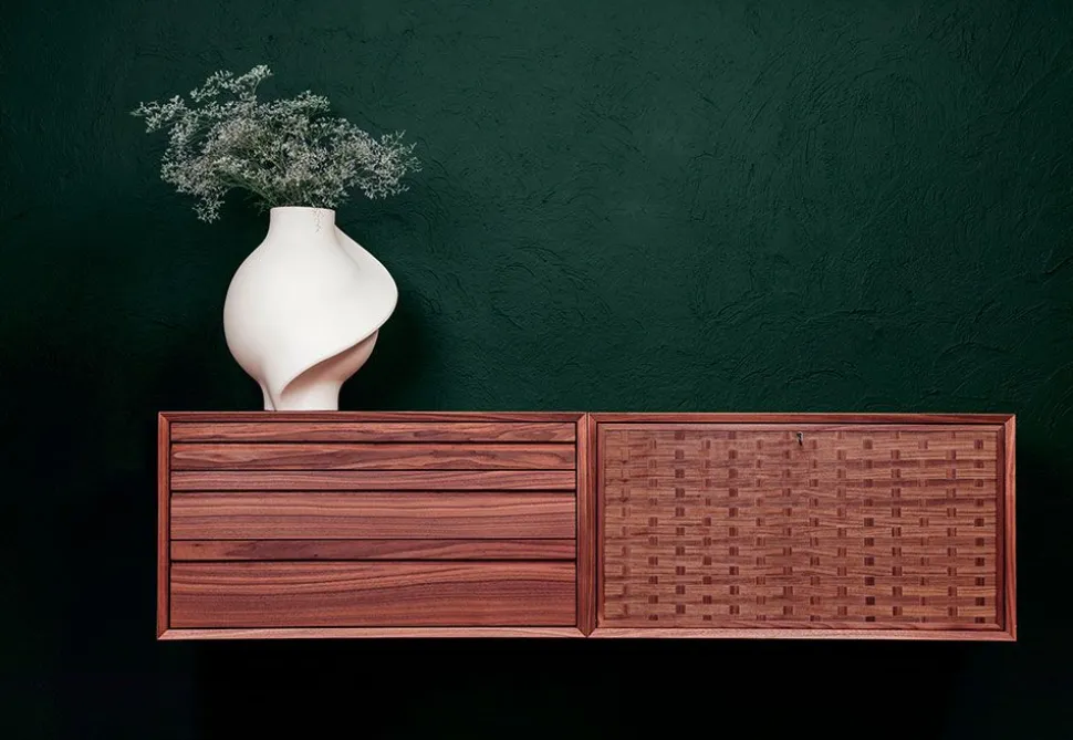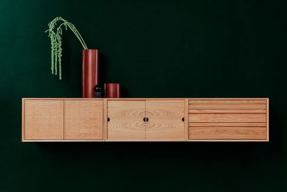 Die Vielseitigkeit der Module ist grenzenlos; sie können einzeln aufgehängt oder zu Sideboards kombiniert werden, ganz nach den individuellen Vorlieben. Erhältlich in Eiche oder Nussbaum, weisen einige Module handgeflochtene Furnierfronten auf, die an das ursprüngliche ROYAL SYSTEM® aus den frühen 1960er Jahren erinnern.