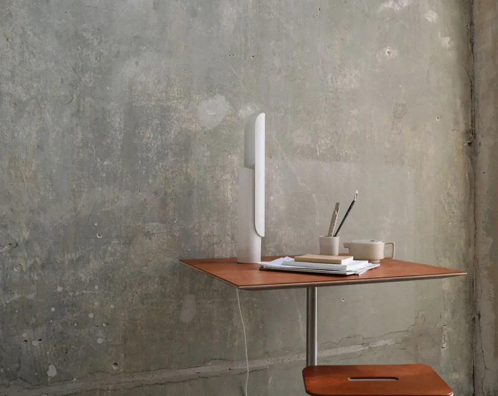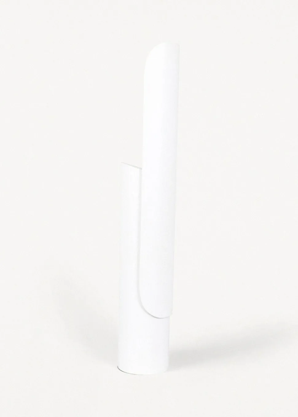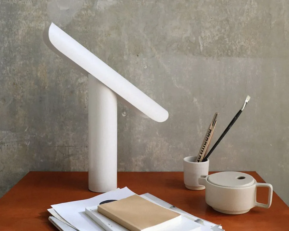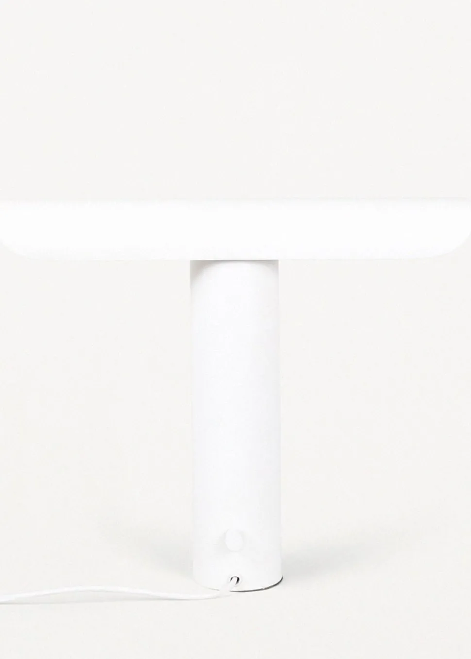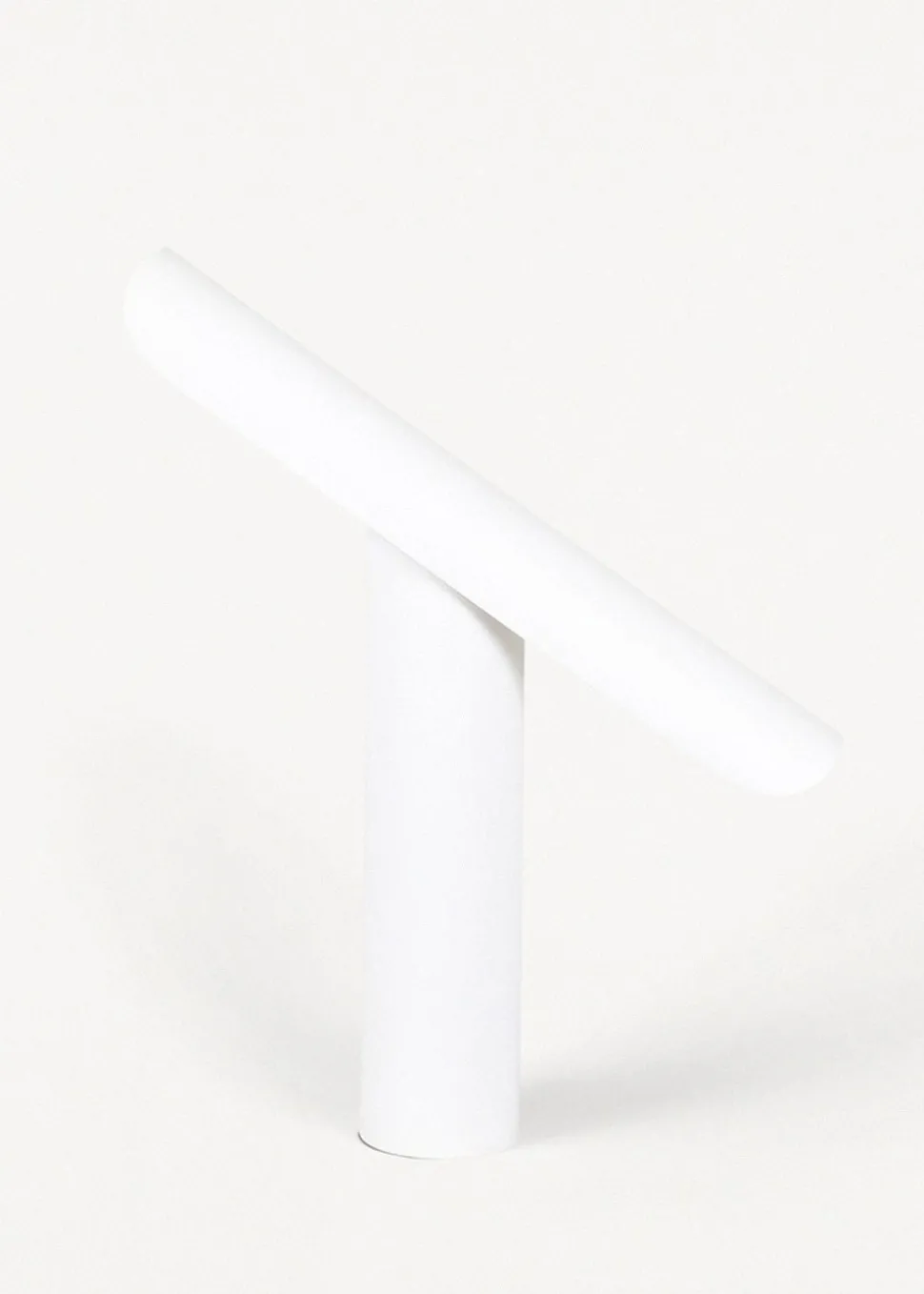T-Lamp ist eine Neuinterpretation der klassischen architektonischen Lampe und wird zu einer geometrischen Skulptur vereinfacht. Trotz des einfachen Designs hat die Leuchte ein stark zentriertes Licht, bei dem der Schirm gekippt werden kann, um das Licht zu steuern.
