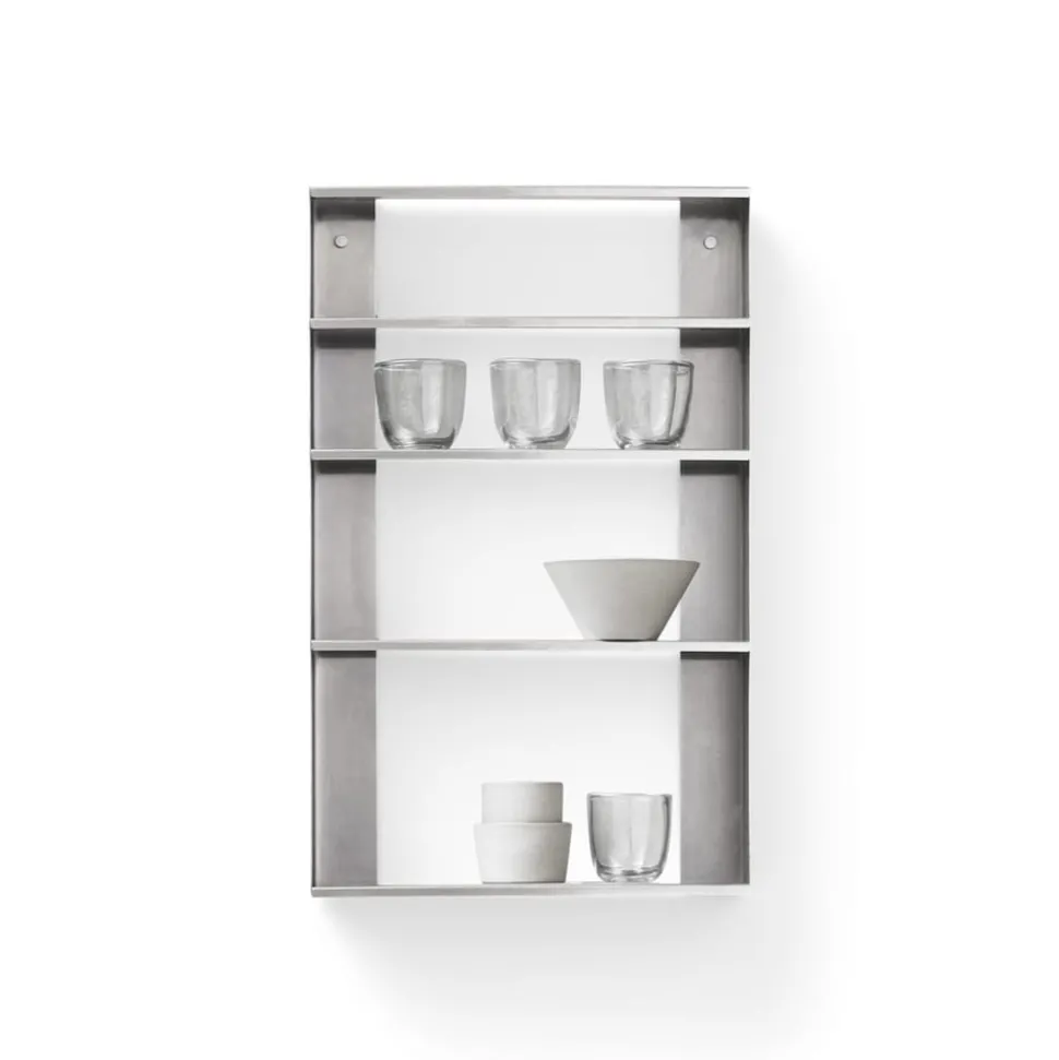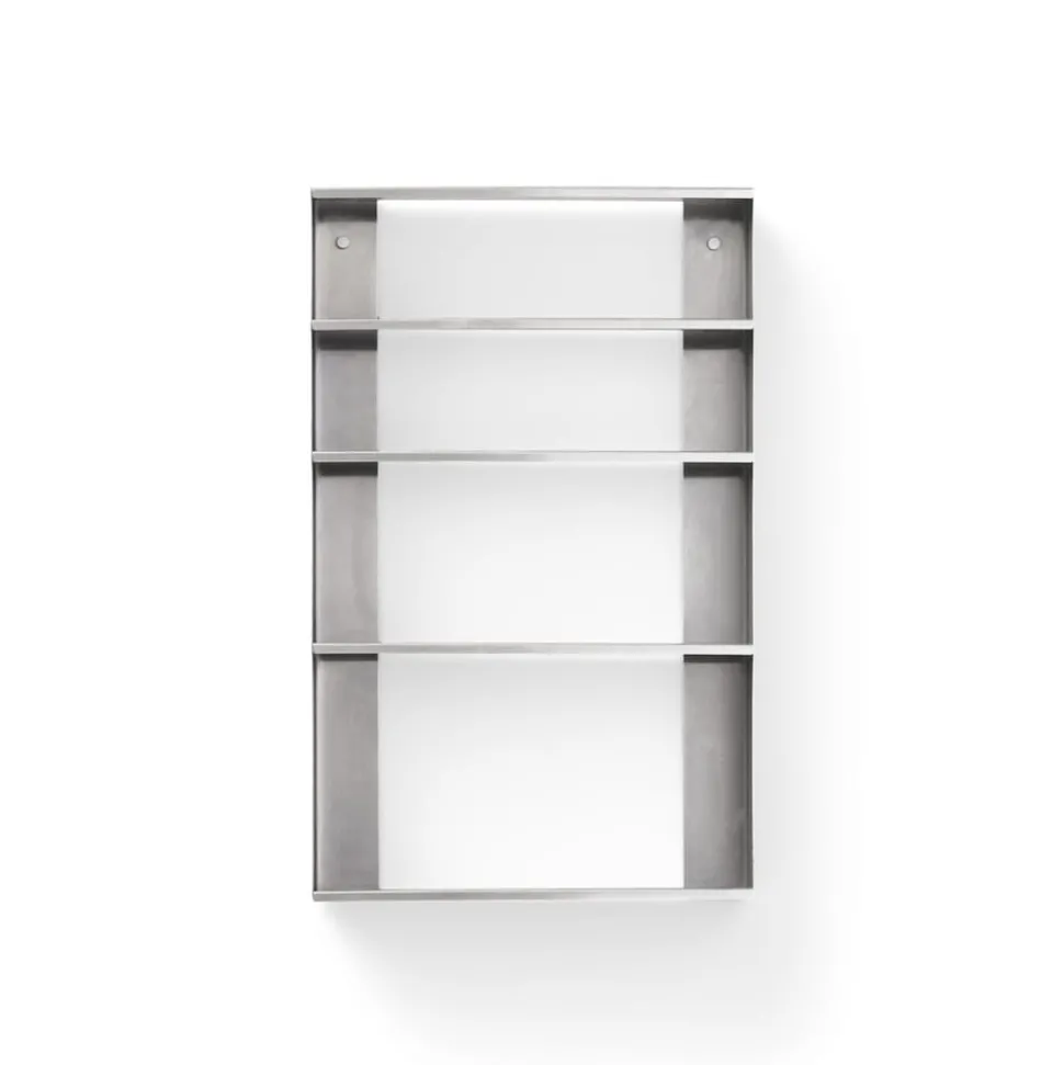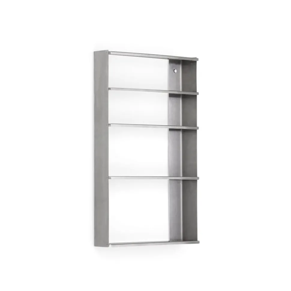 Schönes, geräumiges und minimalistisches Regal, das praktischen Stauraum bietet und überall hinpasst, von der Küche oder dem Bad bis zum Wohnzimmer, Flur oder Büro. Die abgerundeten Kanten der Regale betonen die Details der einzelnen Elemente und schaffen einen schönen, glatten Abschluss der rohen Stahlprofile.