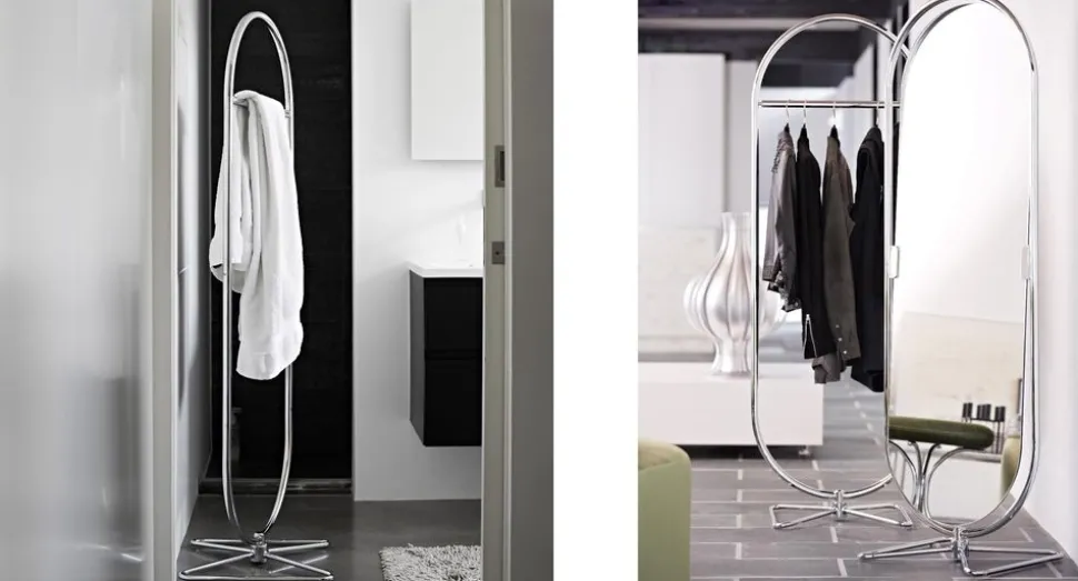 Das System 1-2-3 Mirror wurde 1973 von entworfen. Der Rahmen des Spiegels ist aus verchromtem Stahl gefertigt. Der Spiegel ist 4 mm dick und beidseitig.