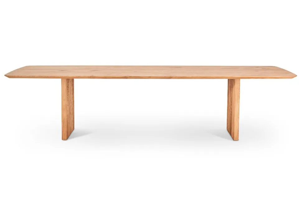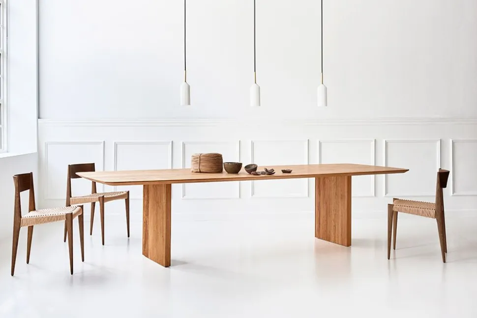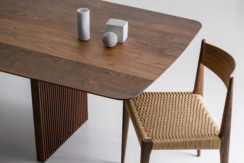 Die Tischplatte und die Beine des Esstisches sind aus Massivholz gefertigt, was dem Design ein schönes Zusammenspiel mit den Gestaltungsdetails verleiht. Zu den feinen Designdetails gehören die abgeschrägte Kante der Tischplatte und die schönen vertikalen Rillen auf dem Würfel.