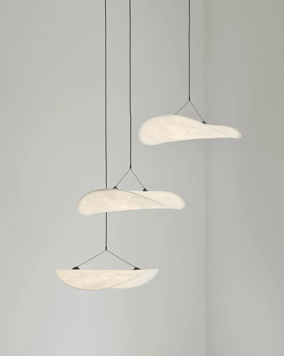 Der von Panter & Tourron im Jahr 2023 entworfene Tense Chandelier von ist eine Hommage an moderne Eleganz und innovative Handwerkskunst. Mit drei kleineren Schirmen aus 100 % recycelbarer Tyvek-Membran, die von schlanken Kohlefaserstäben getragen werden, verbindet dieses Stück Raffinesse mit Nachhaltigkeit.
