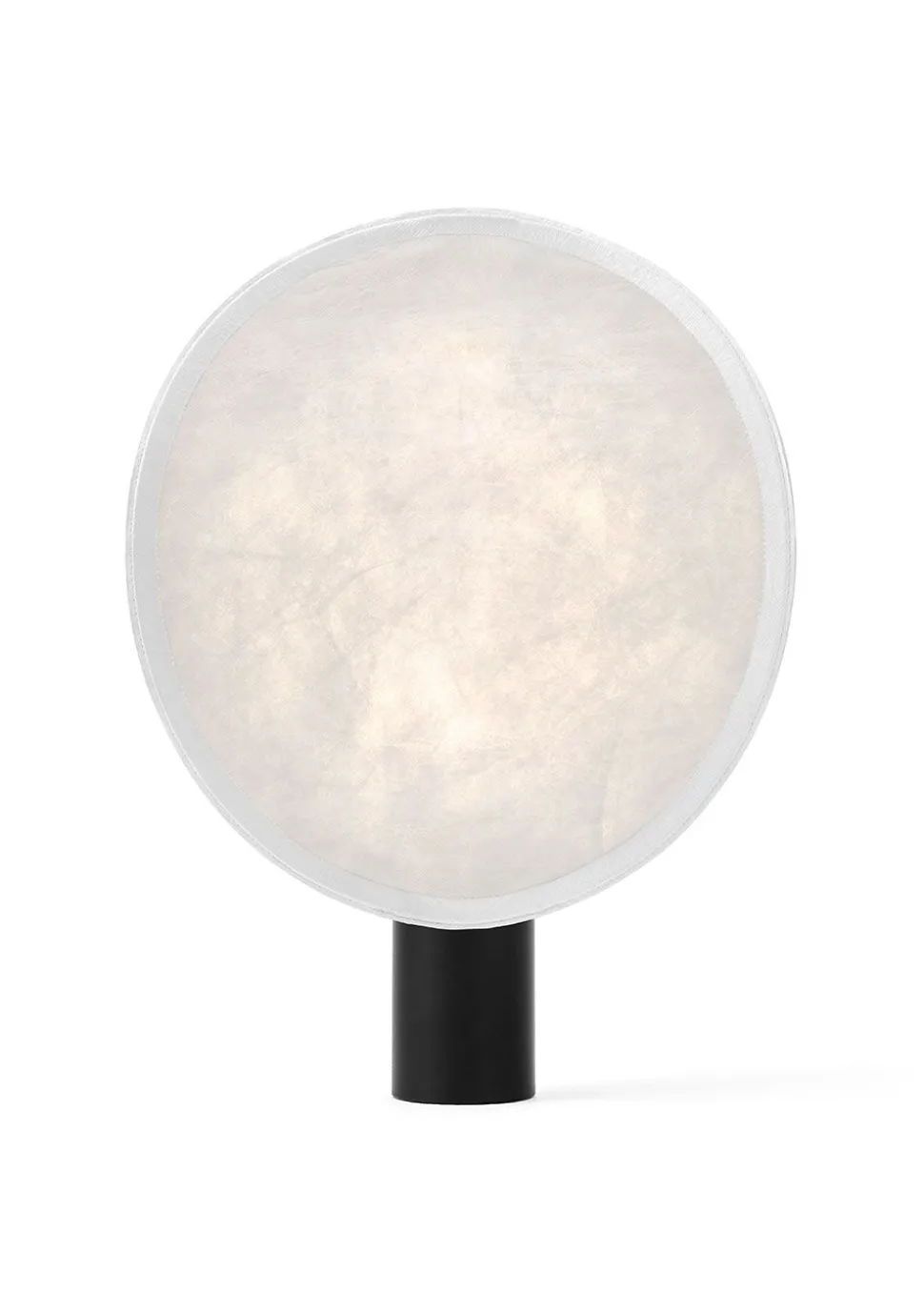 Die Leuchte hat einen zarten, wolkenähnlichen Schirm, ein Markenzeichen der Designsprache von . Ihre ätherische Form wird durch gespannte Kohlefaserstäbe und die Verwendung von Tyvek erreicht, einem leichten, haltbaren und zu 100 % recycelbaren Material, das sorgfältig gewaschen wurde, um einen strukturierten, gewellten Effekt zu erzielen. Die Leuchte ruht anmutig in nahezu senkrechter Position auf einem stromlinienförmigen Sockel und bietet ein bezauberndes haptisches Erlebnis, bei dem man die exquisite Textur des Materials und die weiche Lichtstreuung, die es bietet, zu schätzen weiß.