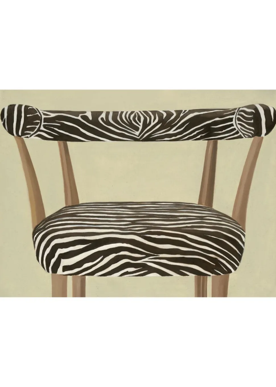 Der von der Stockholmer Künstlerin und Illustratorin Jonna Valtner entworfene „The Chair“ von ist eine exquisite Interpretation des Begehrens und der materiellen Besitztümer, die unsere tägliche Umgebung ausmachen. Dieses einzigartige Möbelstück balanciert elegant zwischen Zurückhaltung und Opulenz, wobei die einfache Konstruktion durch die auffällige Polsterung mit Zebramuster, die sowohl die Sitzfläche als auch die Rückenlehne ziert, aufgewertet wird. Valtner hat meisterhaft Öl auf Leinwand aufgetragen, was zu einer faszinierenden Mischung aus Realismus und Fiktion führt – bei näherer Betrachtung erkennt man die charmanten Unvollkommenheiten des Stücks, die ihm Tiefe und Charakter verleihen.