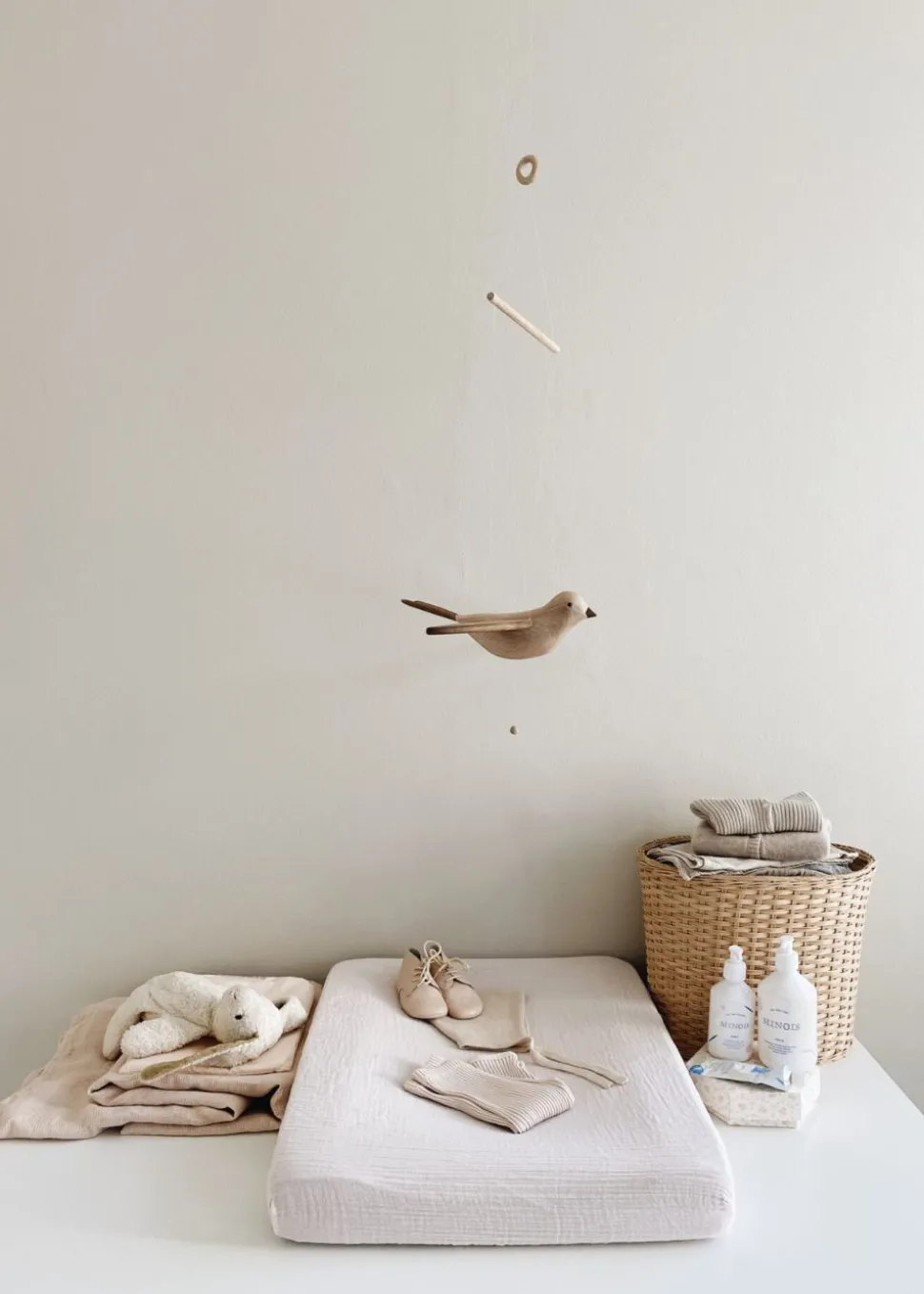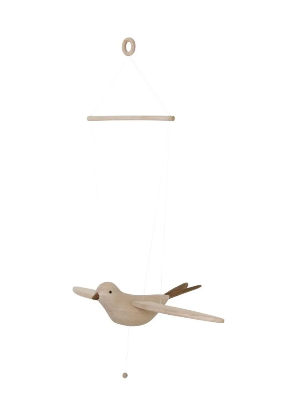 Der Vogel kann mit den Flügeln schlagen, wenn er an der Schnur gezogen wird, und eignet sich perfekt zum Aufhängen über dem Bett oder dem Wickeltisch des Kindes.