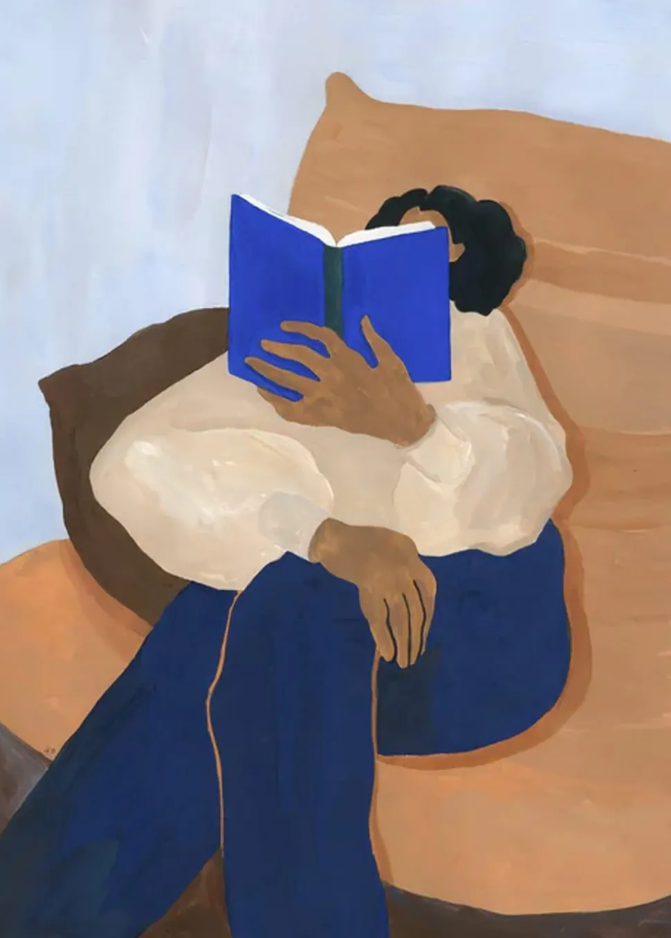 Schöne Frau, die ein Buch vor einem babyblauen Hintergrund liest. Hanna Peterson von The Poster Club ist eine schwedische Künstlerin, die in Kopenhagen lebt. Schon als Kind liebte sie es, Kunst zu schaffen, und dieses Gefühl ist ihr geblieben. Ihre Inspiration für die schönen Poster holt sie sich aus Musik und Gedichten.