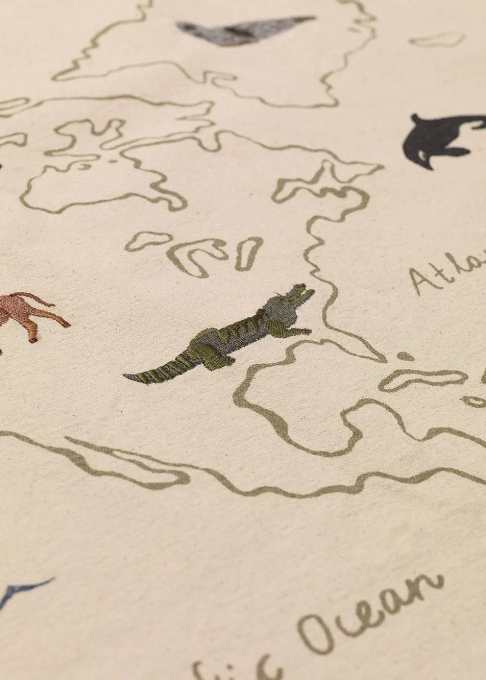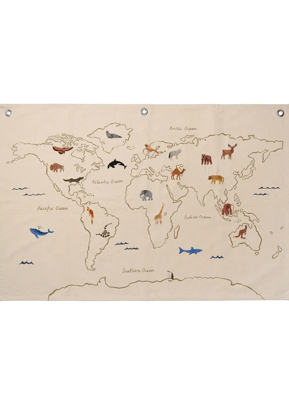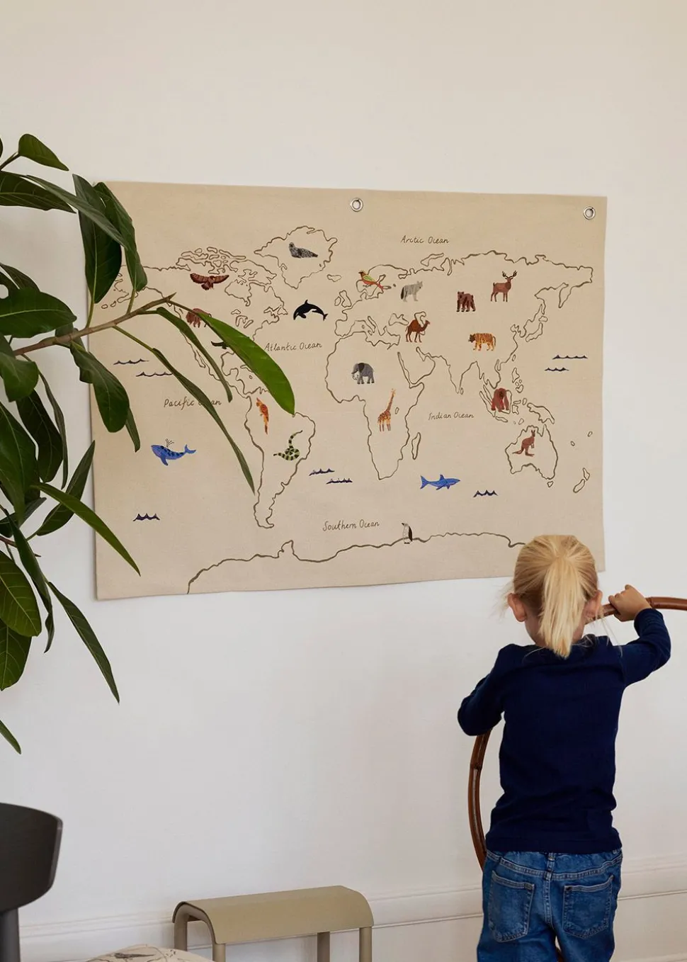 Die World Textile Map von ist eine witzige Alternative zur klassischen Weltkarte und wird mit ihren lustigen Motiven sicher die Aufmerksamkeit Ihres Kindes erregen. Die Karte hat ein neutrales Design mit kleinen gestickten Tieren, die sich über eine gedruckte Weltkarte verteilen. Mit der Weltkarte können Kinder stundenlang die Kontinente und ihre Tierwelt erkunden.