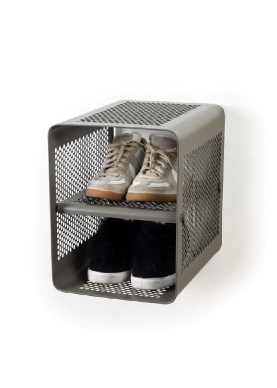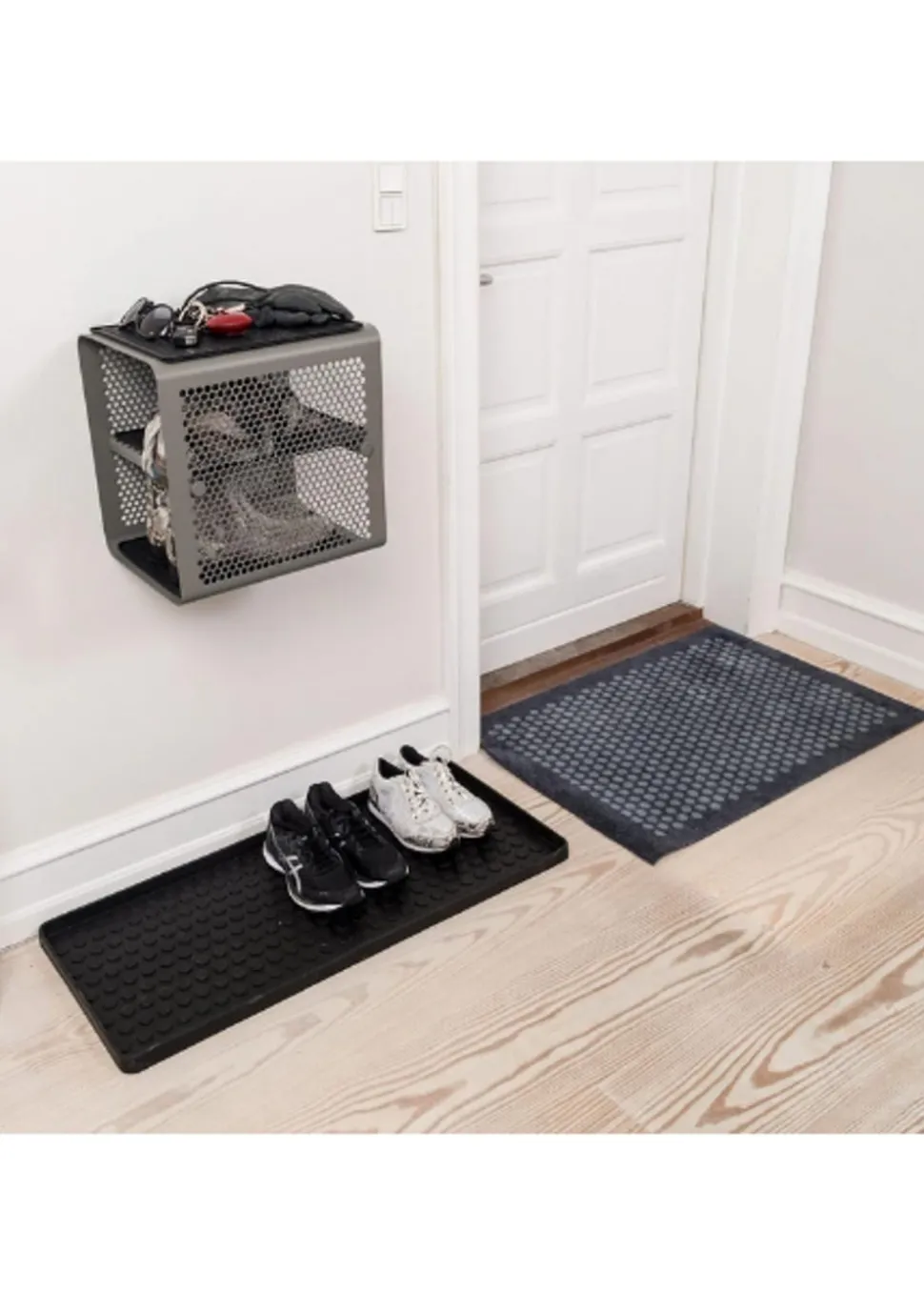 Schönes und praktisches Bücherregal. Leicht zu bewegen und perfekt für die Lagerung. Sie können die Schuhe im unteren, mittleren und oberen Regal unterbringen. Sie können aber auch Fahrradhelme, Taschen usw. oben aufbewahren. Sie können die einzigartige Matte von hinzufügen, die perfekt darunter passt, damit die Schuhe nicht auf den sauberen Boden tropfen, da die Matte den Schmutz aufnimmt. Sie können das Bücherregal auch als Nachttisch verwenden, wo Sie ein Buch, ein Handy usw. aufbewahren können. Die Wandregale können auf zwei verschiedene Arten montiert werden, nämlich entweder an der Wand mit den Regalen seitlich oder vorne, was von Vorteil sein kann, wenn man keinen so breiten Flur hat, dafür ist es perfekt.